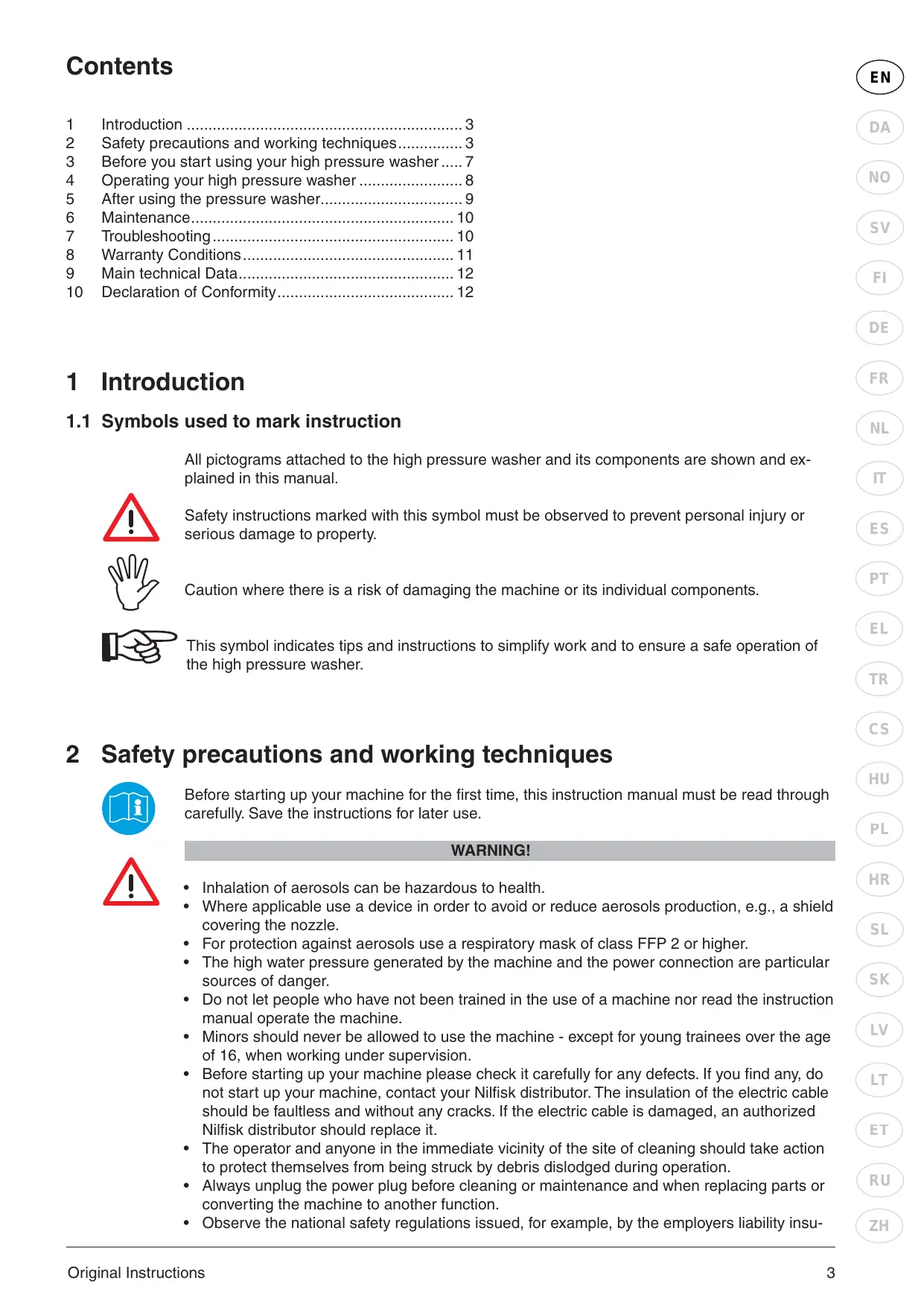 PL WARNING! • Inhalation of aerosols can be hazardous to health. • Where applicable use a device in order to avoid or reduce aerosols production, e.g., a shield covering the nozzle. • For protection against aerosols use a respiratory mask of class FFP 2 or higher. • The high water pressure generated by the machine and the power connection are particular sources of danger. • Do not let people who have not been trained in the use of a machine nor read the instruction manual operate the machine. • Minors should never be allowed to use the machine - except for young trainees over the age of 16, when working under supervision. • Before starting up your machine please check it carefully for any defects. If you find any, do not start up your machine, contact your Nilfisk distributor. The insulation of the electric cable should be faultless and without any cracks. If the electric cable is damaged, an authorized Nilfisk distributor should replace it. • The operator and anyone in the immediate vicinity of the site of cleaning should take action to protect themselves from being struck by debris dislodged during operation. • Always unplug the power plug before cleaning or maintenance and when replacing parts or converting the machine to another function. • Observe the national safety regulations issued, for example, by the employers liability insuOriginal Instructions