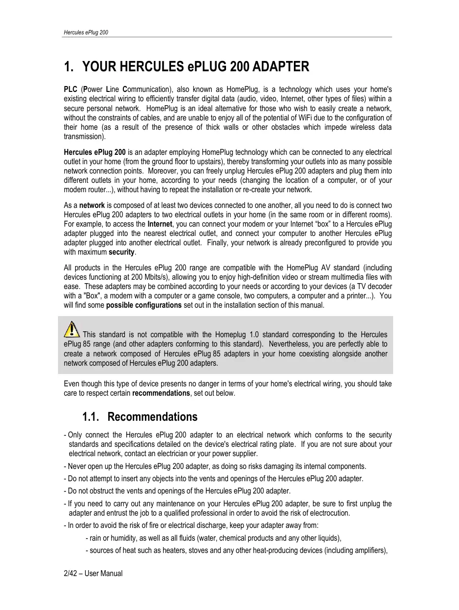 1. YOUR HERCULES ePLUG 200 ADAPTER PLC (Power Line Communication), also known as HomePlug, is à technology which uses your homes existing electrical wiring to effciently transfer digital data (audio, video, Intemet, other types of les) within à secure personal network. HomePlug is an ideal altemative for those who wish to easily create a network, without the constraints of cables, and are unable to enjoy al of the potential of WiFi due to the configuration of their home (as à result of the presence of thick walls or other obstacles which impede wireless data transmission)