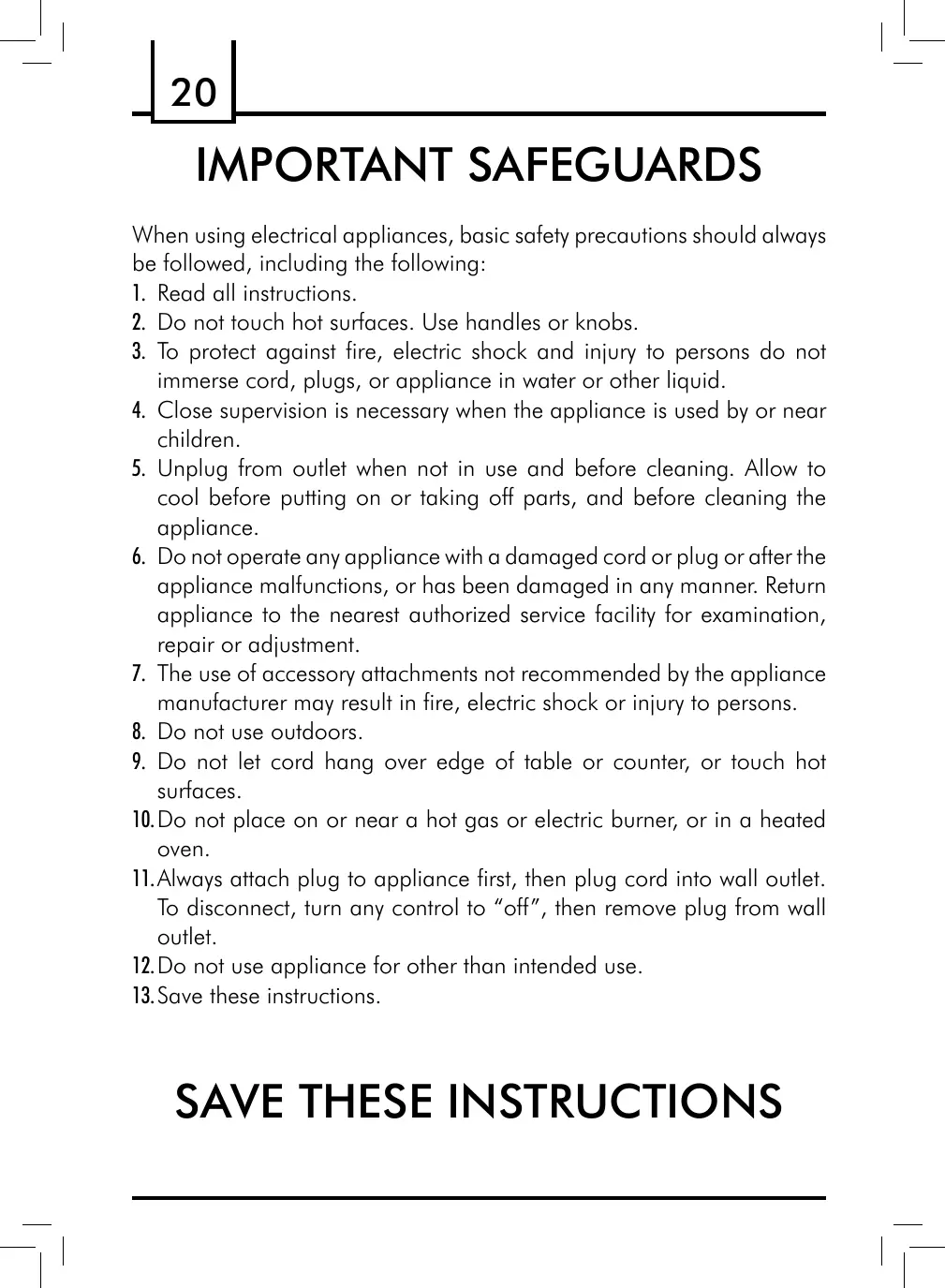 IMPORTANT SAFEGUARDS When using electrical appliances, basic safety precautions should always be followed, including the following: