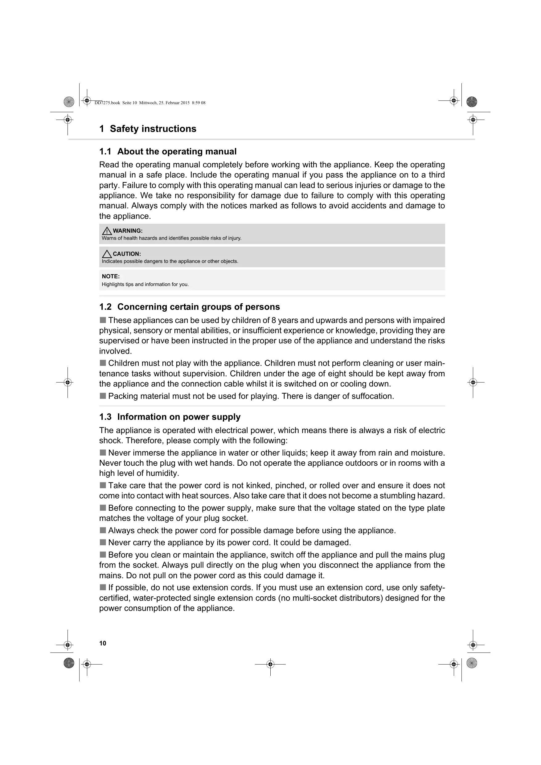 These appliances can be used by children of 8 years and upwards and persons with impaired physical, sensory or mental abilities, or insufficient experience or knowledge, providing they are supervised or have been instructed in the proper use of the appliance and understand the risks involved. Children must not play with the appliance. Children must not perform cleaning or user maintenance tasks without supervision. Children under the age of eight should be kept away from the appliance and the connection cable whilst it is switched on or cooling down. Packing material must not be used for playing. There is danger of suffocation.