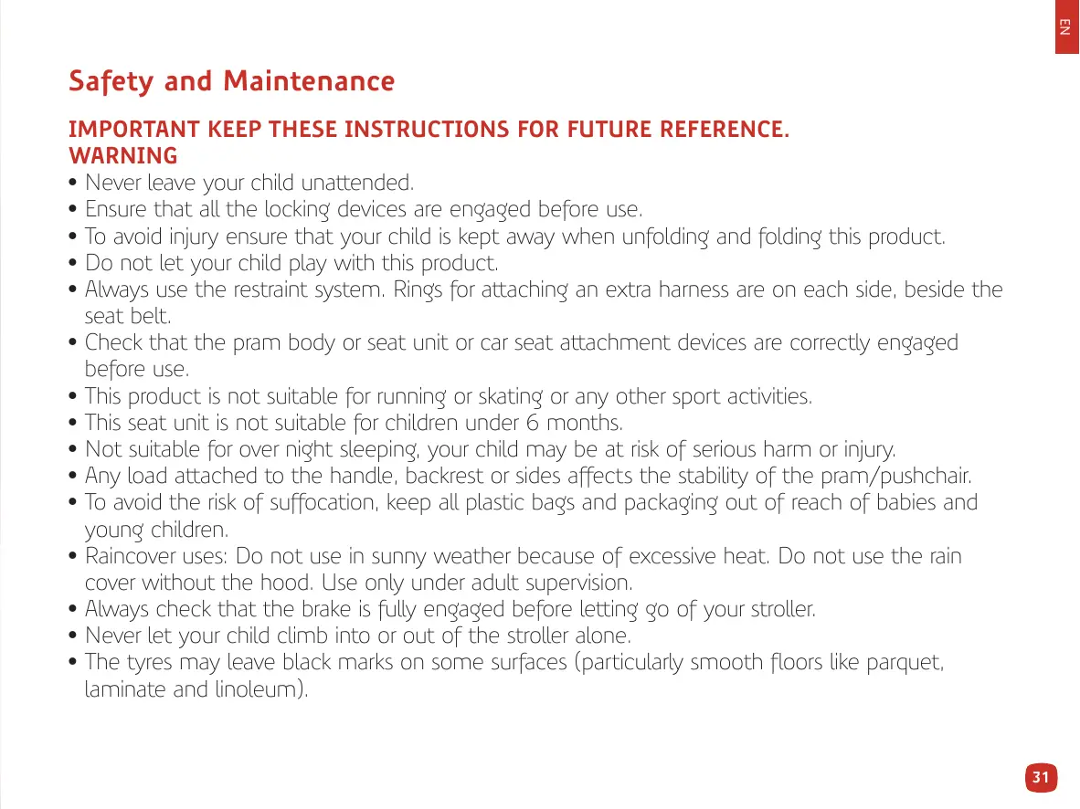 WARNING •• Never leave your child unattended. •• Ensure that all the locking devices are engaged before use. •• To avoid injury ensure that your child is kept away when unfolding and folding this product. •• Do not let your child play with this product. •• Always use the restraint system. Rings for attaching an extra harness are on each side, beside the seat belt. •• Check that the pram body or seat unit or car seat attachment devices are correctly engaged before use. •• This product is not suitable for running or skating or any other sport activities. •• This seat unit is not suitable for children under 6 months. •• Not suitable for over night sleeping, your child may be at risk of serious harm or injury. •• Any load attached to the handle, backrest or sides affects the stability of the pram/pushchair. •• To avoid the risk of suffocation, keep all plastic bags and packaging out of reach of babies and young children. •• Raincover uses: Do not use in sunny weather because of excessive heat. Do not use the rain cover without the hood. Use only under adult supervision. •• Always check that the brake is fully engaged before letting go of your stroller. •• Never let your child climb into or out of the stroller alone. •• The tyres may leave black marks on some surfaces (particularly smooth floors like parquet, laminate and linoleum).