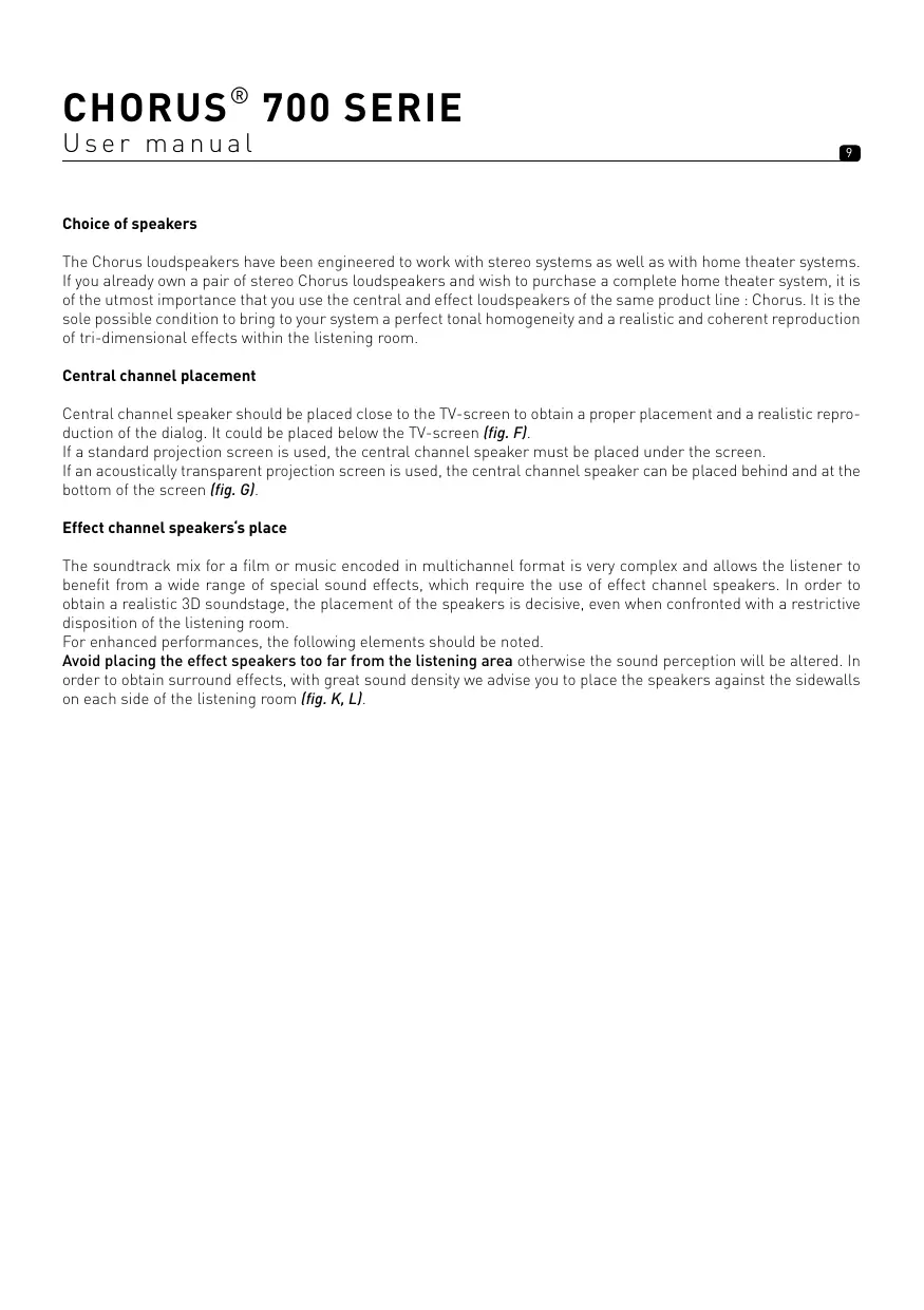The Chorus loudspeakers have been engineered to deliver the most faithful sound reproduction, whether they are used for music or home cinema. In order to enhance their performance, to guarantee a high quality of listening, sound image and tone balance, it is important to note the following basic rules.