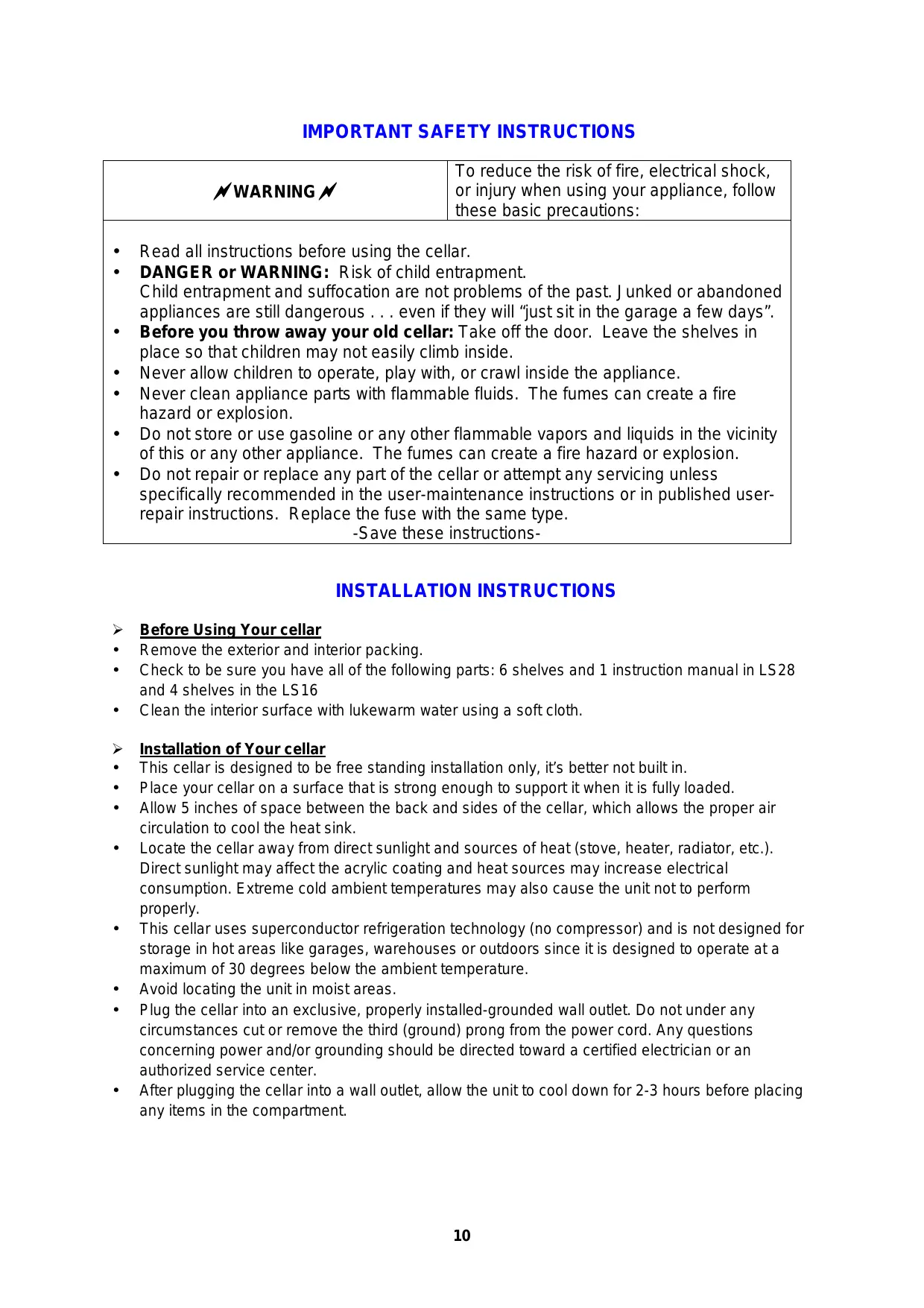 To reduce the risk of fire, electrical shock, or injury when using your appliance, follow these basic precautions: Read all instructions before using the cellar. DANGER or WARNING: Risk of child entrapment. Child entrapment and suffocation are not problems of the past. Junked or abandoned appliances are still dangerous . . . even if they will “just sit in the garage a few days”. Before you throw away your old cellar: Take off the door. Leave the shelves in place so that children may not easily climb inside. Never allow children to operate, play with, or crawl inside the appliance. Never clean appliance parts with flammable fluids. The fumes can create a fire hazard or explosion. Do not store or use gasoline or any other flammable vapors and liquids in the vicinity of this or any other appliance. The fumes can create a fire hazard or explosion. Do not repair or replace any part of the cellar or attempt any servicing unless specifically recommended in the user-maintenance instructions or in published userrepair instructions. Replace the fuse with the same type. -Save these instructions- INSTALLATION INSTRUCTIONS