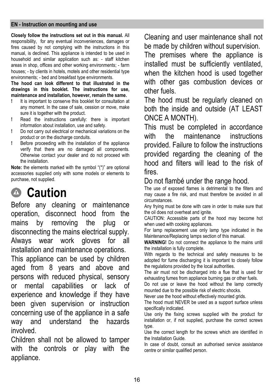 EN - Instruction on mounting and use Closely follow the instructions set out in this manual. All responsibility, for any eventual inconveniences, damages or fires caused by not complying with the instructions in this manual, is declined. This appliance is intended to be used in household and similar application such as: - staff kitchen areas in shop, offices and other working environments; - farm houses; - by clients in hotels, motels and other residential type environments; - bed and breakfast type environments. The hood can look different to that illustrated in the drawings in this booklet. The instructions for use, maintenance and installation, however, remain the same. It is important to conserve this booklet for consultation at any moment. In the case of sale, cession or move, make sure it is together with the product. Read the instructions carefully: there is important information about installation, use and safety. Do not carry out electrical or mechanical variations on the product or on the discharge conduits. Before proceeding with the installation of the appliance verify that there are no damaged all components. Otherwise contact your dealer and do not proceed with the installation. Note: the elements marked with the symbol “(*)” are optional accessories supplied only with some models or elements to purchase, not supplied. Cleaning and user maintenance shall not be made by children without supervision. The premises where the appliance is installed must be sufficiently ventilated, when the kitchen hood is used together with other gas combustion devices or other fuels. The hood must be regularly cleaned on both the inside and outside (AT LEAST ONCE A MONTH). This must be completed in accordance with the maintenance instructions provided. Failure to follow the instructions provided regarding the cleaning of the hood and filters will lead to the risk of fires. Do not flambé under the range hood. Caution The use of exposed flames is detrimental to the filters and may cause a fire risk, and must therefore be avoided in all circumstances. Any frying must be done with care in order to make sure that the oil does not overheat and ignite. CAUTION: Accessible parts of the hood may become hot when used with cooking appliances. For lamp replacement use only lamp type indicated in the Maintenance/Replacing lamps section of this manual. WARNING! Do not connect the appliance to the mains until the installation is fully complete. With regards to the technical and safety measures to be adopted for fume discharging it is important to closely follow the regulations provided by the local authorities. The air must not be discharged into a flue that is used for exhausting fumes from appliance burning gas or other fuels. Do not use or leave the hood without the lamp correctly mounted due to the possible risk of electric shocks. Never use the hood without effectively mounted grids. The hood must NEVER be used as a support surface unless specifically indicated. Use only the fixing screws supplied with the product for installation or, if not supplied, purchase the correct screws type. Use the correct length for the screws which are identified in the Installation Guide. In case of doubt, consult an authorised service assistance centre or similar qualified person. Before any cleaning or maintenance operation, disconnect hood from the mains by removing the plug or disconnecting the mains electrical supply. Always wear work gloves for all installation and maintenance operations. This appliance can be used by children aged from 8 years and above and persons with reduced physical, sensory or mental capabilities or lack of experience and knowledge if they have been given supervision or instruction concerning use of the appliance in a safe way and understand the hazards involved. Children shall not be allowed to tamper with the controls or play with the appliance.