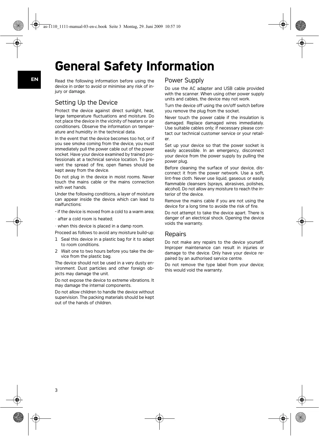 General Safety Information Read the following information before using the device in order to avoid or minimise any risk of injury or damage. Setting Up the Device Protect the device against direct sunlight Protect the device against direct sunlight, heat, large temperature fluctuations and moisture. Do not place the device in the vicinity of heaters or air conditioners. Observe the information on temperature and humidity in the technical data. In the event that the device becomes too hot, or if you see smoke coming from the device In the event that the device becomes too hot, or if you see smoke coming from the device, you must immediately pull the power cable out of the power socket. Have your device examined by trained professionals at a technical service location. To prevent the spread of fire, open flames should be kept away from the device. Do not plug in the device in moist rooms. Do not plug in the device in moist rooms. Never touch the mains cable or the mains connection with wet hands. Moisture build-up Under the following conditions, a layer of moisture can appear inside the device which can lead to malfunctions: - if the device is moved from a cold to a warm area;