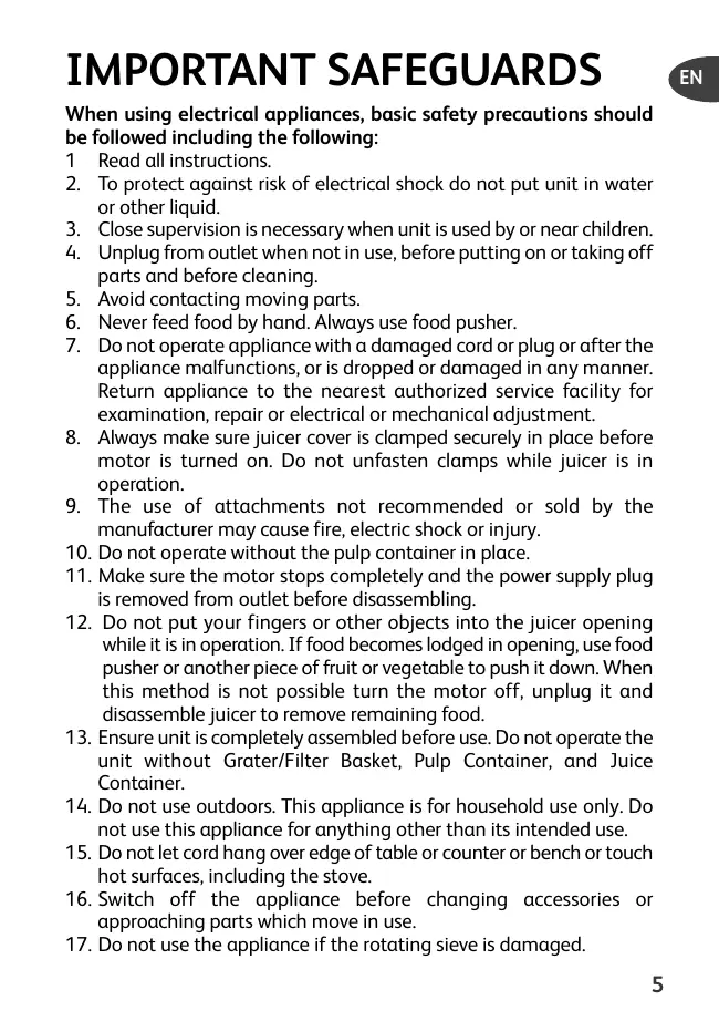 13. Ensure unit is completely assembled before use. Do not operate the unit without Grater/Filter Basket, Pulp Container, and Juice Container.