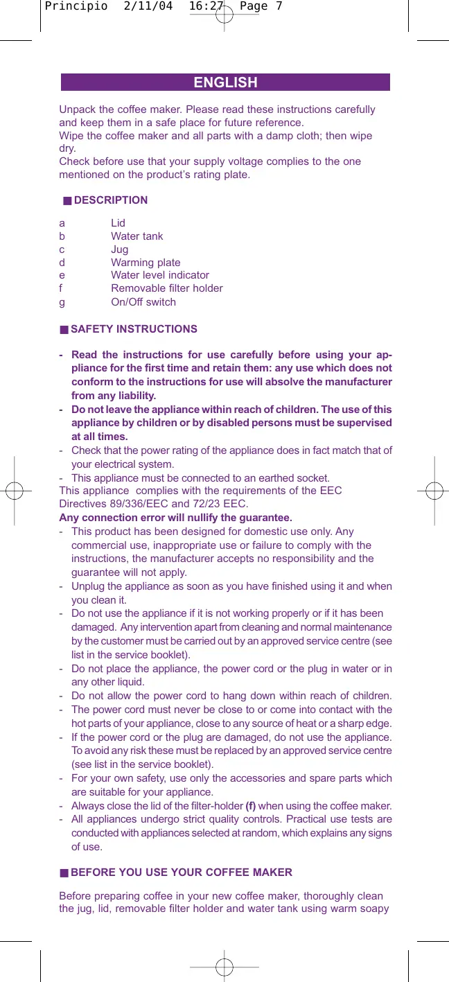 - Always close the lid of the filter-holder (f) when using the coffee maker.