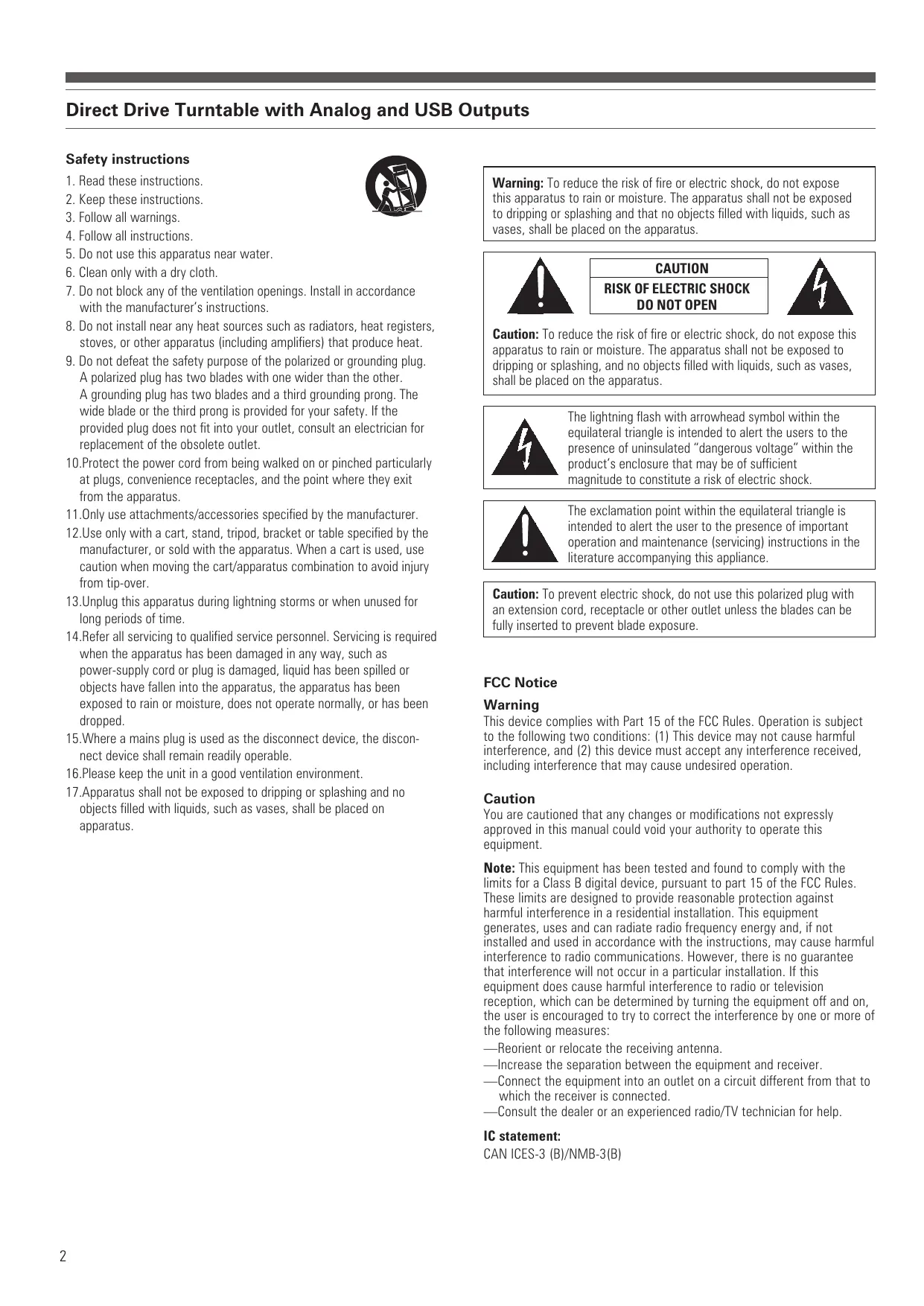 Direct Drive Turntable - AT-LP5 with Analog and USB Outputs Platine tourne-disque à entraînement direct AT-LP5 sorties RCA analogiques et USB Giradisco de tracciòn directa AT-LP5 con salidas RCA estéreo analogico y USB Installation and Operation Pages 2-7 Installation et utilisation Pages 8-13 Instalación y funcionamiento Páginas 14-19 Direct Drive Turntable with Analog and USB Outputs Safety instructions