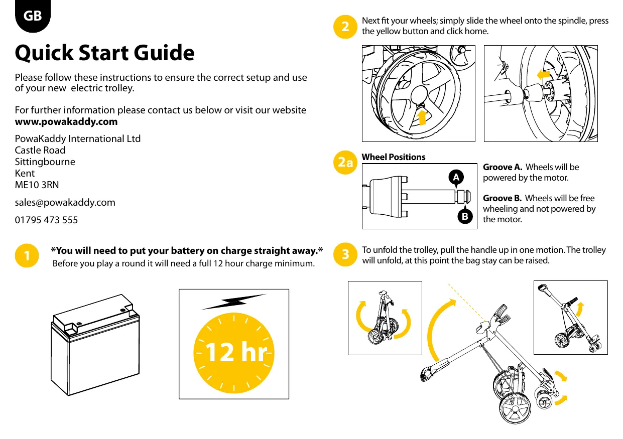 Next fit your wheels; simply slide the wheel onto the spindle, press the yellow button and click home. Quick Start Guide Please follow these instructions to ensure the correct setup and use of your new electric trolley. For further information please contact us below or visit our website www.powakaddy.com PowaKaddy International Ltd Castle Road Sittingbourne Kent ME10 3RN