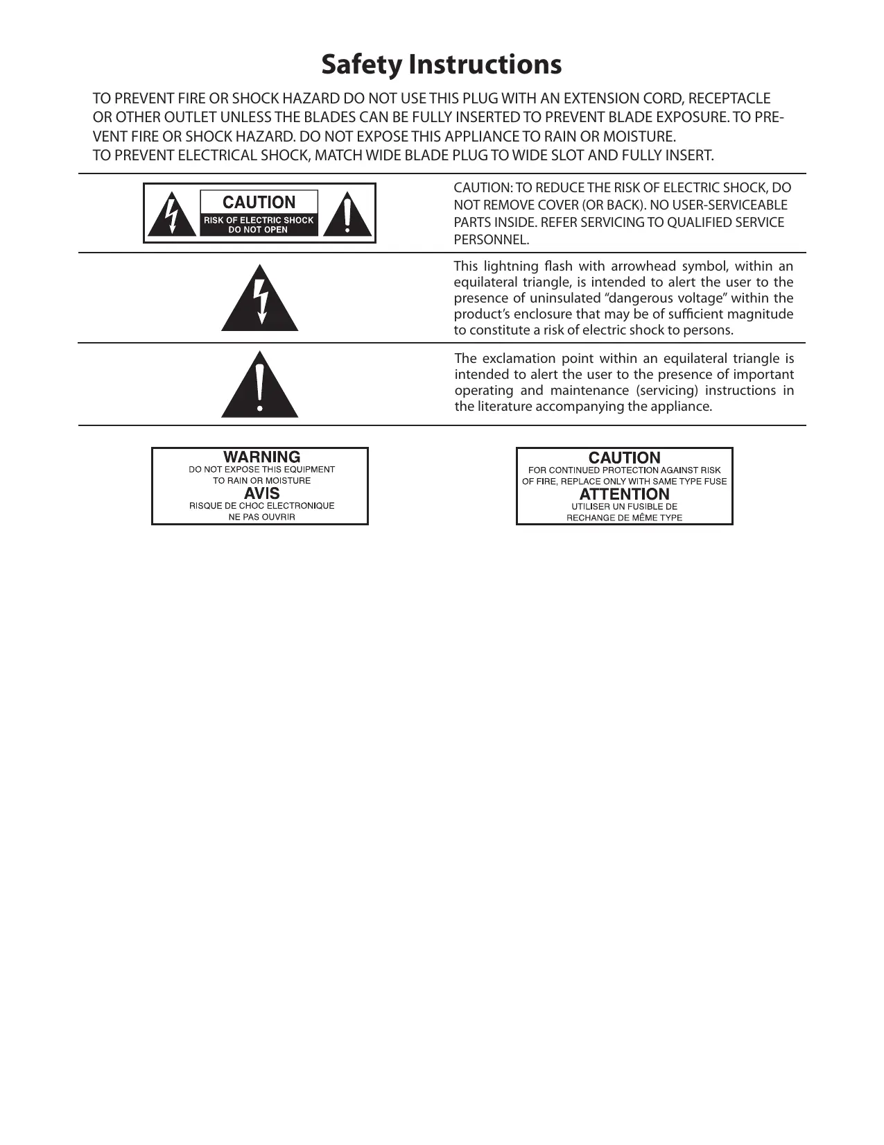 TO PREVENT FIRE OR SHOCK HAZARD DO NOT USE THIS PLUG WITH AN EXTENSION CORD, RECEPTACLE OR OTHER OUTLET UNLESS THE BLADES CAN BE FULLY INSERTED TO PREVENT BLADE EXPOSURE. TO PREVENT FIRE OR SHOCK HAZARD. DO NOT EXPOSE THIS APPLIANCE TO RAIN OR MOISTURE. TO PREVENT ELECTRICAL SHOCK, MATCH WIDE BLADE PLUG TO WIDE SLOT AND FULLY INSERT.