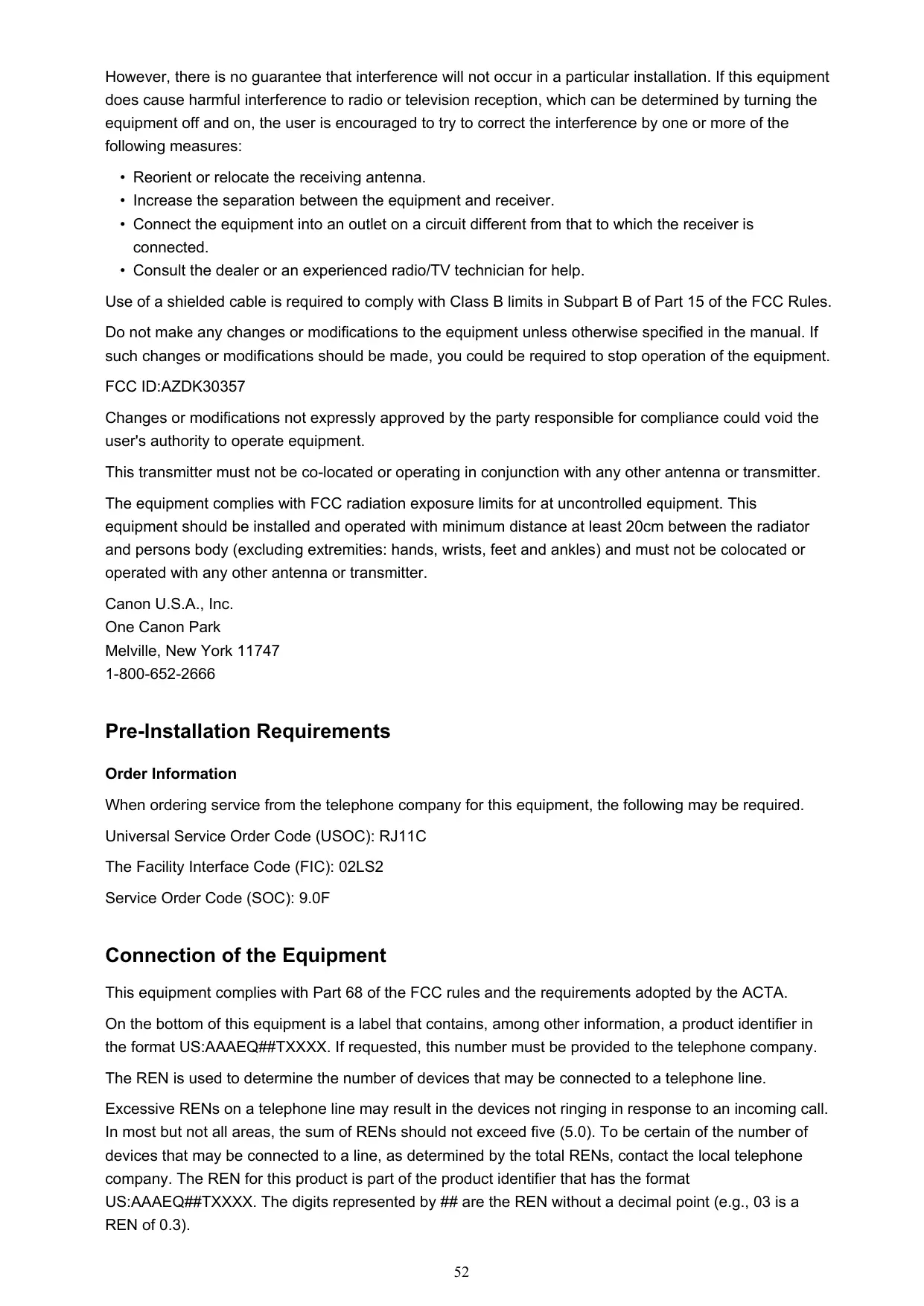 Changes or modifications not expressly approved by the party responsible for compliance could void the user's authority to operate equipment. This transmitter must not be co-located or operating in conjunction with any other antenna or transmitter. The equipment complies with FCC radiation exposure limits for at uncontrolled equipment. This equipment should be installed and operated with minimum distance at least 20cm between the radiator and persons body (excluding extremities: hands, wrists, feet and ankles) and must not be colocated or operated with any other antenna or transmitter. Canon U.S.A., Inc. One Canon Park Melville, New York 11747 1-800-652-2666 Pre-Installation Requirements Order Information When ordering service from the telephone company for this equipment, the following may be required. Universal Service Order Code (USOC): RJ11C The Facility Interface Code (FIC): 02LS2 Service Order Code (SOC): 9.0F Connection of the Equipment This equipment complies with Part 68 of the FCC rules and the requirements adopted by the ACTA. On the bottom of this equipment is a label that contains, among other information, a product identifier in the format US:AAAEQ##TXXXX. If requested, this number must be provided to the telephone company. The REN is used to determine the number of devices that may be connected to a telephone line. Excessive RENs on a telephone line may result in the devices not ringing in response to an incoming call. In most but not all areas, the sum of RENs should not exceed five (5.0). To be certain of the number of devices that may be connected to a line, as determined by the total RENs, contact the local telephone company. The REN for this product is part of the product identifier that has the format US:AAAEQ##TXXXX. The digits represented by ## are the REN without a decimal point (e.g., 03 is a REN of 0.3).
