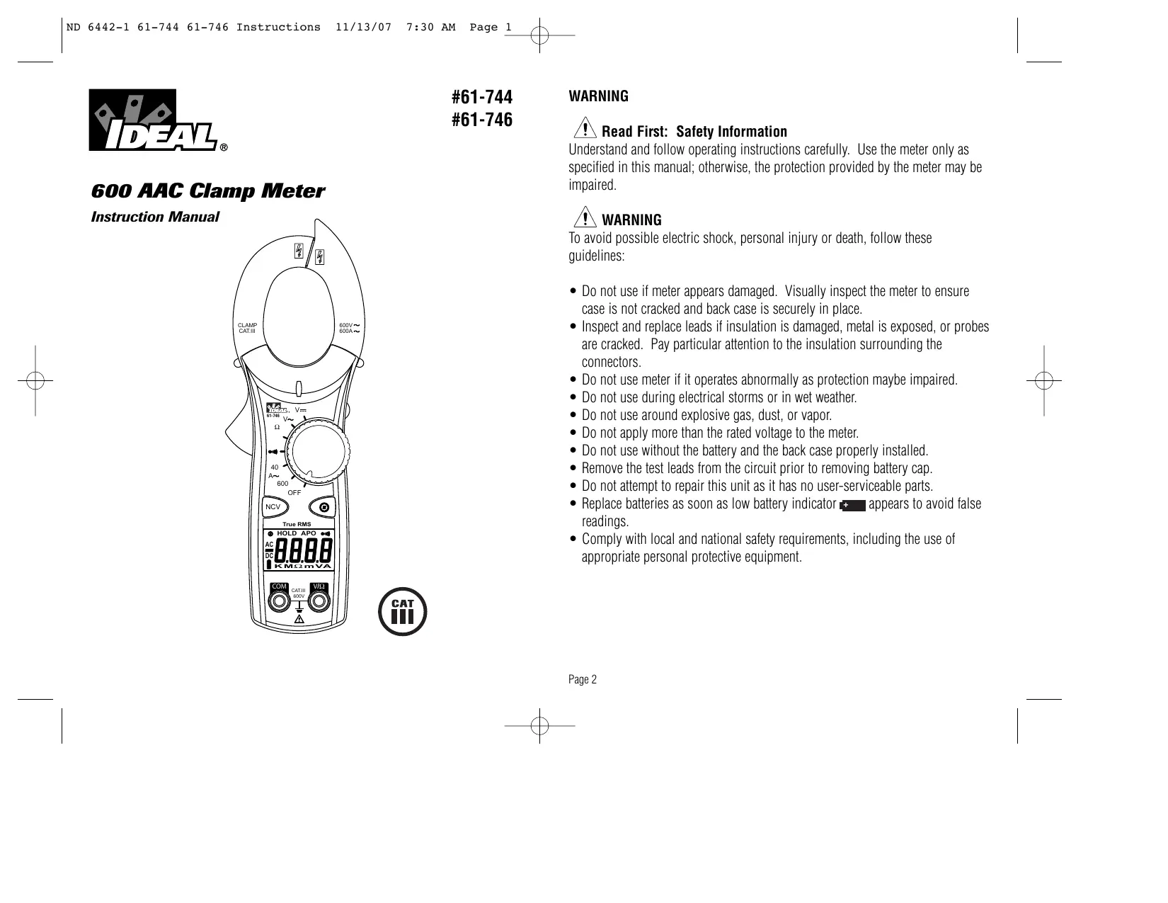 - Accuracy stated for crest factor ≤ 3 Input Impedance is 10MΩ. Page 10 Overload Protection 600AAC 600 VDC or AC rms 600 VDC or AC rms 600 VDC or AC rms Response time: 500ms Page 9 61-746 Warranty Statement: This tester is warranted to the original purchaser against defects in material and workmanship for two years from the date of purchase. During this warranty period, IDEAL INDUSTRIES, INC. will, at its option, replace or repair the defective unit, subject to verification of the defect or malfunction. This warranty does not cover fuses, batteries or damage from abuse, neglect, accident, unauthorized repair, alteration, or unreasonable use of the instrument. Any implied warranties arising out of the sale of an IDEAL product, including but not limited to implied warranties of merchantability and fitness for a particular purpose, are limited to the above. The manufacturer shall not be liable for loss of use of the instrument or other incidental or consequential damages, expenses, or economic loss, or for any claim or claims for such damage, expenses or economic loss. CLAMP CAT.III State laws vary, so the above limitations or exclusions may not apply to you. This warranty gives you specific legal rights, and you may also have other rights which vary from state to state. 600V 600A 61-746