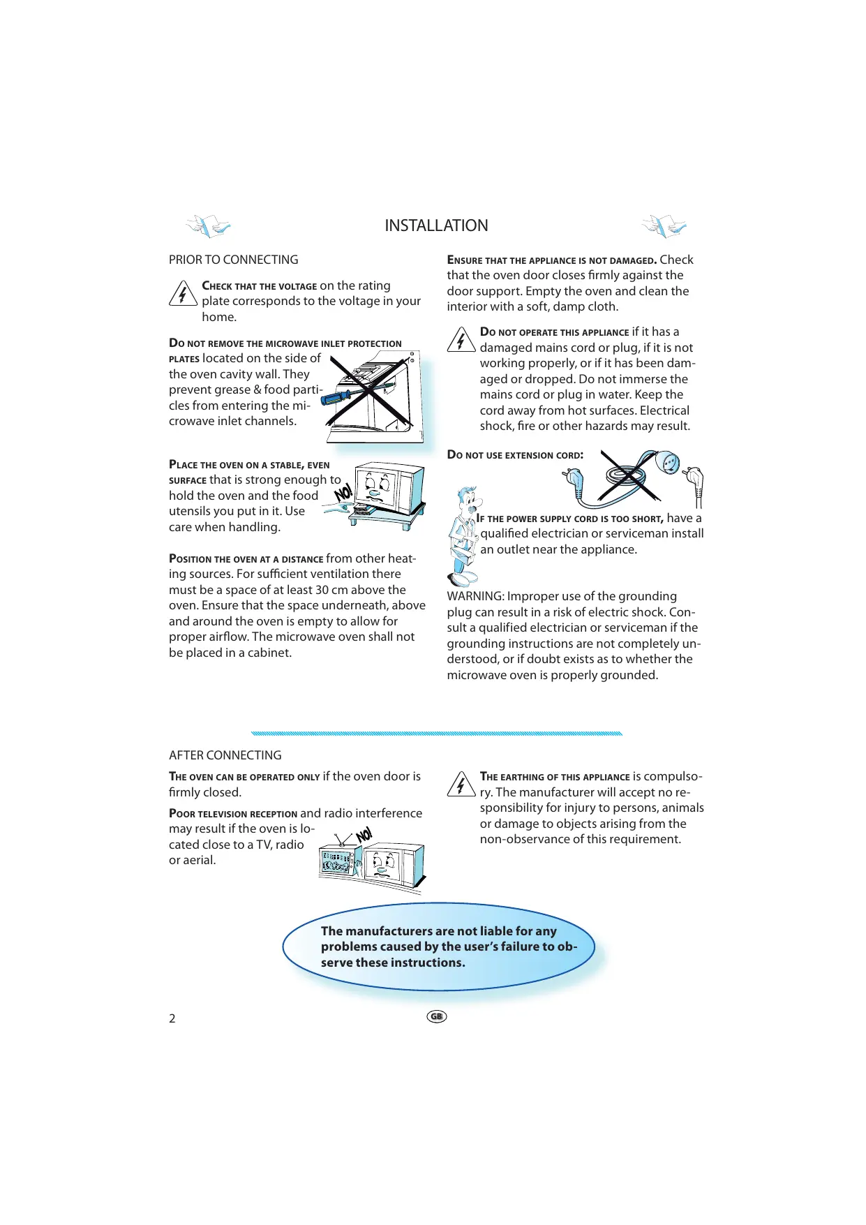 plug can result in a risk of electric shock. Consult a qualified electrician or serviceman if the grounding instructions are not completely understood, or if doubt exists as to whether the microwave oven is properly grounded. AFTER CONNECTING THE OVEN CAN BE OPERATED ONLY if the oven door is firmly closed. THE EARTHING OF THIS APPLIANCE is compulsory. The manufacturer will accept no responsibility for injury to persons, animals or damage to objects arising from the non-observance of this requirement. POOR TELEVISION RECEPTION and radio interference may result if the oven is located close to a TV, radio or aerial. The manufacturers are not liable for any problems caused by the user’s failure to observe these instructions.