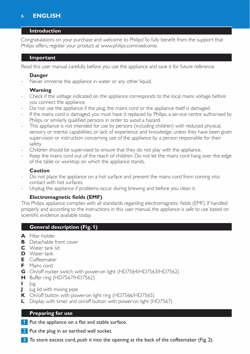 This Philips appliance complies with all standards regarding electromagnetic fields (EMF). If handled properly and according to the instructions in this user manual, the appliance is safe to use based on scientific evidence available today. General description (Fig. 1)