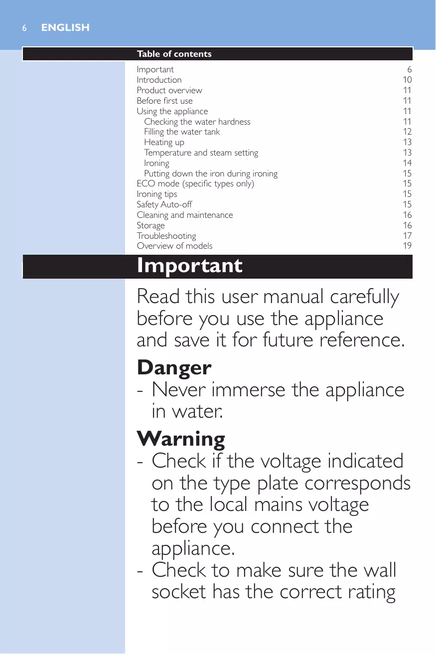 Vérification de la dureté de l’eau Remplissage du réservoir Temps de chauffe Température et réglage de la vapeur Repassage Mettre le fer sur son talon pendant le repassage Mode ECO (certains modèles uniquement) Conseils pour le repassage Arrêt automatique Nettoyage et entretien Rangement Dépannage Aperçu des modèles