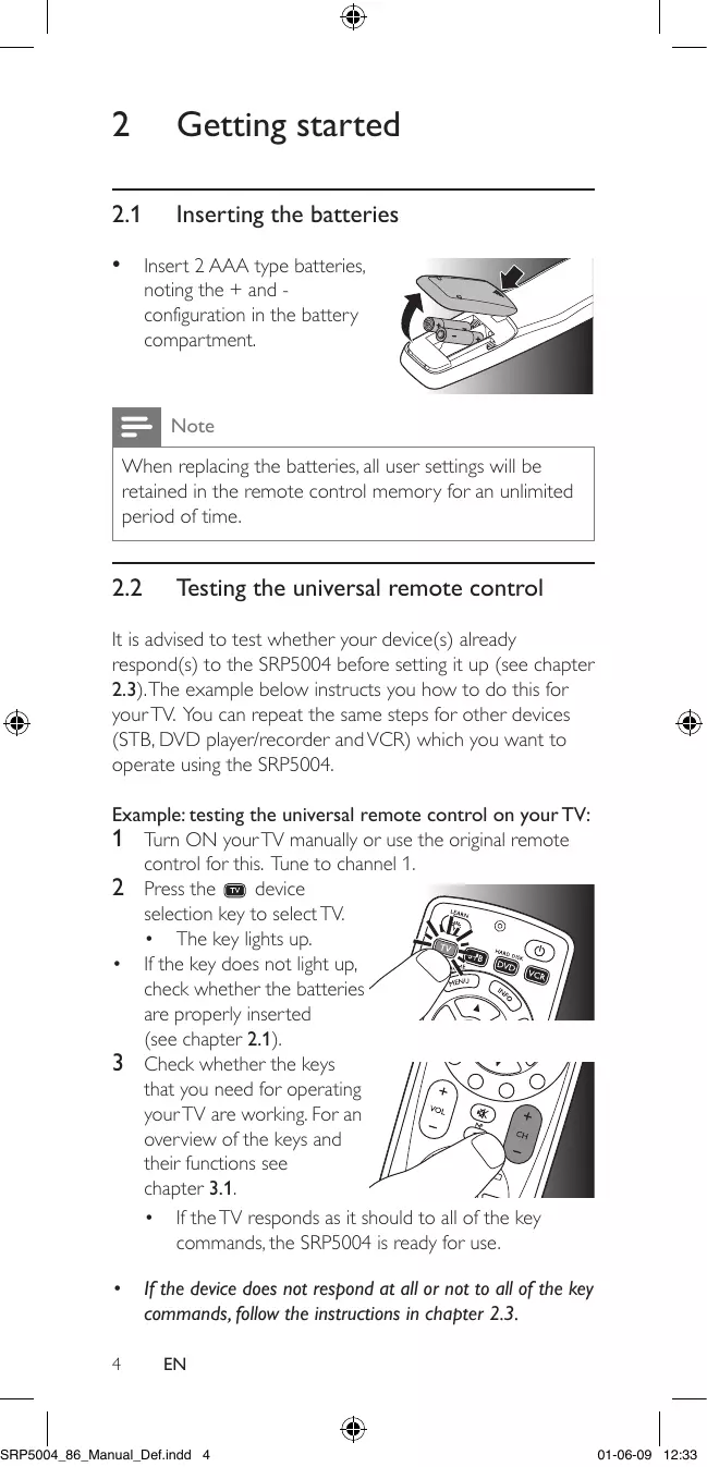 • Check whether you are using the correct keys to switch on Teletext. For TV this is the key; for STB this is the key. Batteries Will my settings be deleted when I replace the batteries? No. All user settings will be retained in the remote control memory during battery replacement. SRP5004_86_Manual_Def.indd 13