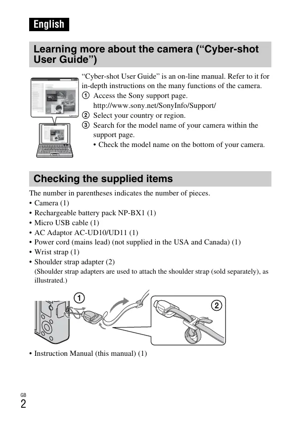 English Learning more about the camera (“Cyber-shot User Guide”) “Cyber-shot User Guide” is an on-line manual. Refer to it for in-depth instructions on the many functions of the camera. 1 Access the Sony support page. http://www.sony.net/SonyInfo/Support/ 2 Select your country or region. 3 Search for the model name of your camera within the support page.