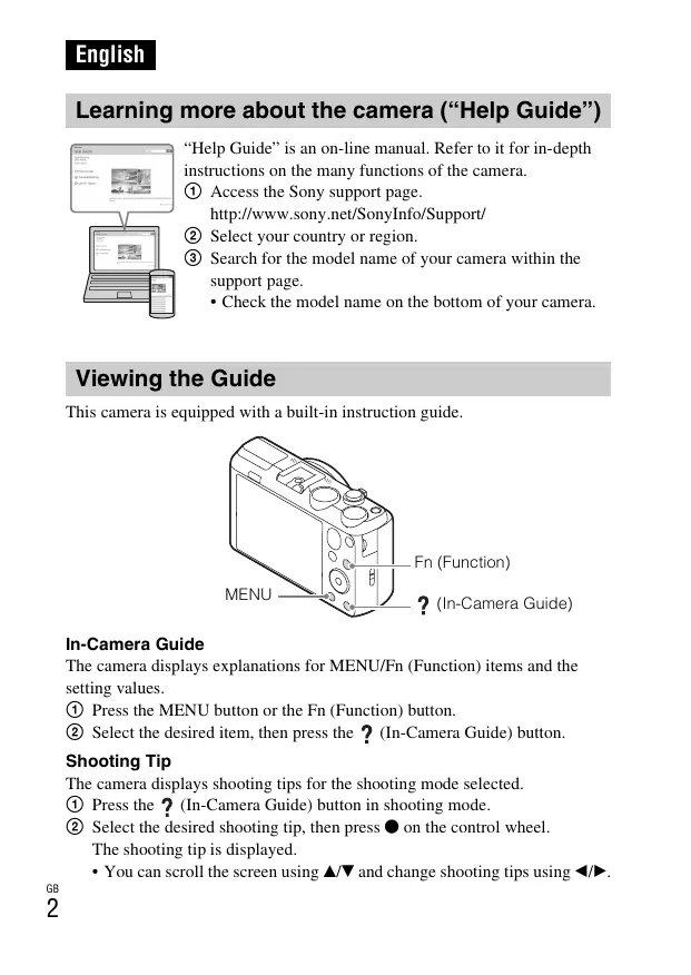 - Check the model name on the bottom of your camera. Viewing the Guide This camera is equipped with a built-in instruction guide. (In-Camera Guide) In-Camera Guide The camera displays explanations for MENU/Fn (Function) items and the setting values. 1 Press the MENU button or the Fn (Function) button. 2 Select the desired item, then press the (In-Camera Guide) button. Shooting Tip The camera displays shooting tips for the shooting mode selected. 1 Press the (In-Camera Guide) button in shooting mode. 2 Select the desired shooting tip, then press z on the control wheel. The shooting tip is displayed.