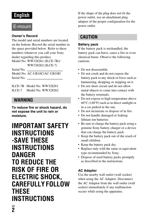 E-mount Owner’s Record The model and serial numbers are located on the bottom. Record the serial number in the space provided below. Refer to these numbers whenever you call your Sony dealer regarding this product. Model No. WW328261 (ILCE-7R)/ WW328262 (ILCE-7) Serial No. Model No. AC-UB10C/AC-UB10D Serial No. ILCE-7R Model No. WW328261 ILCE-7 Model No. WW328262