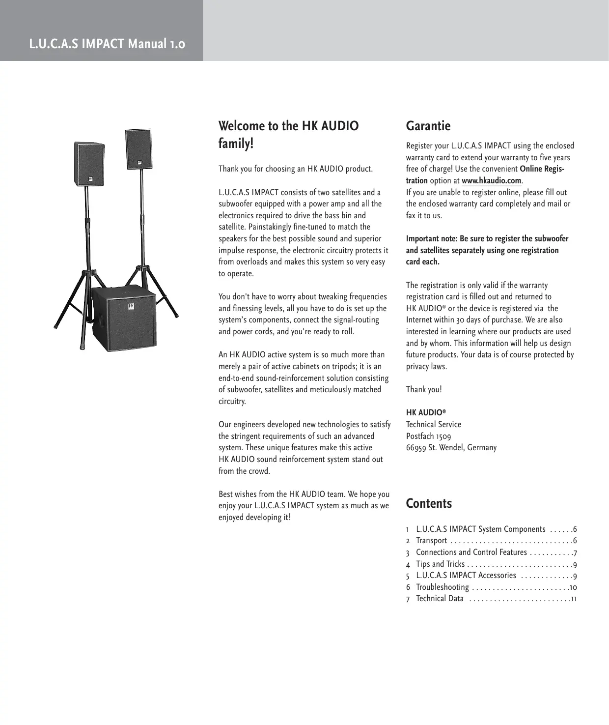 Register your L.U.C.A.S IMPACT using the enclosed warranty card to extend your warranty to five years free of charge! Use the convenient Online Registration option at www.hkaudio.com.