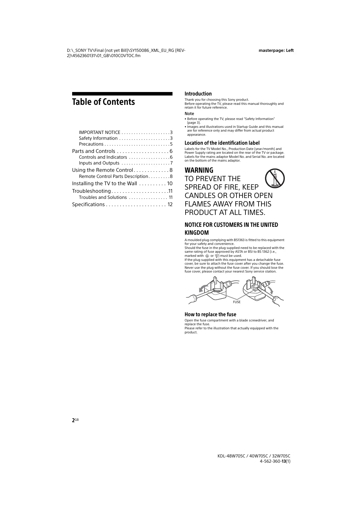 KINGDOM A moulded plug complying with B51363 is ftted to this equipment for your safety and convenience Should the fuse in the plug supplied need to be replaced with the same rating of fuse approved by ASTA or BSI 0 ES 1362 (Le. marked with @ or SP) must be used. Ifthe plug supplied with this equipment has a detachable fuse caver, be sure to attach the fuse cover after you change the fuse. Never use the plug without the fuse cover. I you should lose the fuse cover, please contact your nearest Sony service station, How to replace the fuse Open the fuse compartment with a blade screwdriver, and replace the fuse. Please refer to the ilustration that actually equipped with the product KDL-48W705C / 40W705C / 32W705C 4-562-360-13(1)