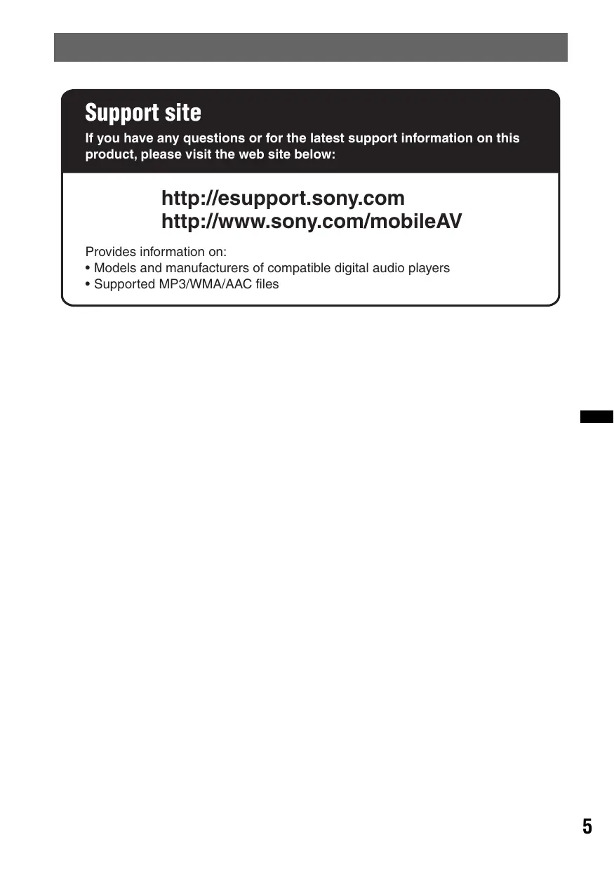 http://esupport.sony.com http://www.sony.com/mobileAV Provides information on: