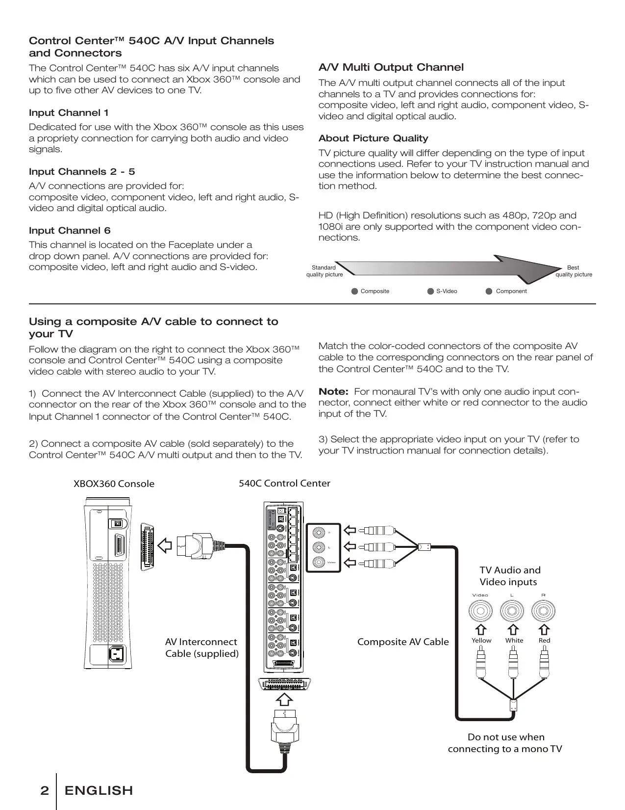 Using a composite A/V cable to connect to your TV Follow the diagram on the right to connect the Xbox 360™ console and Control Center™ 540C using a composite video cable with stereo audio to your TV.