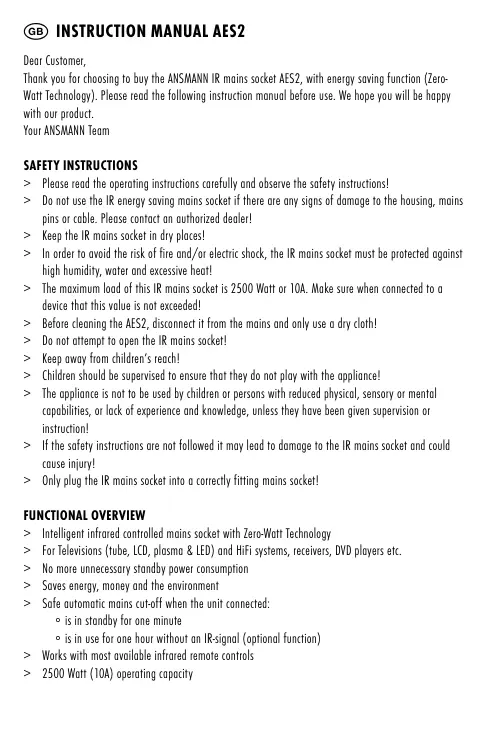 GB Instruction manual AES2 Dear Customer, Thank you for choosing to buy the ANSMANN IR mains socket AES2, with energy saving function (ZeroWatt Technology). Please read the following instruction manual before use. We hope you will be happy with our product. Your ANSMANN Team SAFETY INSTRUCTIONS > Please read the operating instructions carefully and observe the safety instructions! > Do not use the IR energy saving mains socket if there are any signs of damage to the housing, mains pins or cable. Please contact an authorized dealer! > Keep the IR mains socket in dry places! > In order to avoid the risk of fire and/or electric shock, the IR mains socket must be protected against high humidity, water and excessive heat! > The maximum load of this IR mains socket is 2500 Watt or 10A. Make sure when connected to a device that this value is not exceeded! > Before cleaning the AES2, disconnect it from the mains and only use a dry cloth! > Do not attempt to open the IR mains socket! > Keep away from children’s reach! > Children should be supervised to ensure that they do not play with the appliance! > The appliance is not to be used by children or persons with reduced physical, sensory or mental capabilities, or lack of experience and knowledge, unless they have been given supervision or instruction! > If the safety instructions are not followed it may lead to damage to the IR mains socket and could cause injury! > Only plug the IR mains socket into a correctly fitting mains socket! FUNCTIONAL OVERVIEW > Intelligent infrared controlled mains socket with Zero-Watt Technology > For Televisions (tube, LCD, plasma & LED) and HiFi systems, receivers, DVD players etc. > No more unnecessary standby power consumption > Saves energy, money and the environment > Safe automatic mains cut-off when the unit connected: ∘ is in standby for one minute ∘ is in use for one hour without an IR-signal (optional function) > Works with most available infrared remote controls > 2500 Watt (10A) operating capacity