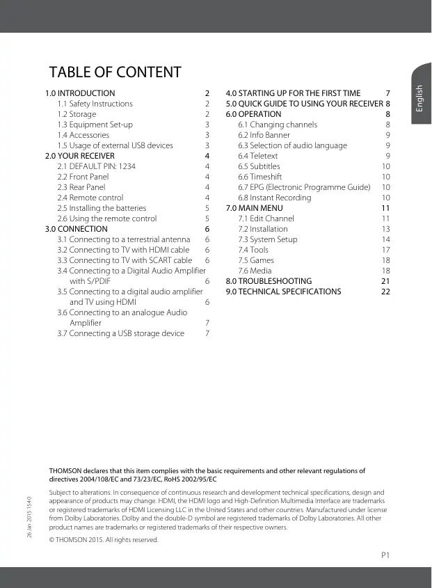 32 Connecting to TVwith HDMI cable 6 74 Too 7 33 Connecting to TV with SCART cable 6 75 Games 18 34 Connecting to a Digital Audio Amplifier 76 Media 18 smith S/PDIF 6 80TROUBLESHOOTING 2 35 Connecting to a digital audio amplifier 9.0 TECHNICAL SPECIFICATIONS 2 and TV using HDMI 6 36 Connecting to an analogue Audio Amplifier 7 37 Connecting a USB storage device 7 THOMSON declares that this item complies with the basi requirements and other relevant reguitions of rectves 2004/108/EC and 73/23/EC, RoHS 2002/95/EC Subject to atertions In consequence continuous research and development technical pecfcations design and appearance of products maÿ change. HDML the HDM logo and High Defition Mutimedia Irrace are rademars or registered trdemaris of HDMI Licensing LLC i the United States and ether countries Manufscured under cense from Dolby Laberatois.Delby and the doule D symbol ar registered trademars of Bol Labortares Alother product names at adematks ar tegstered trademals other respective owners STHOMSON 2018. Alighrs reserved