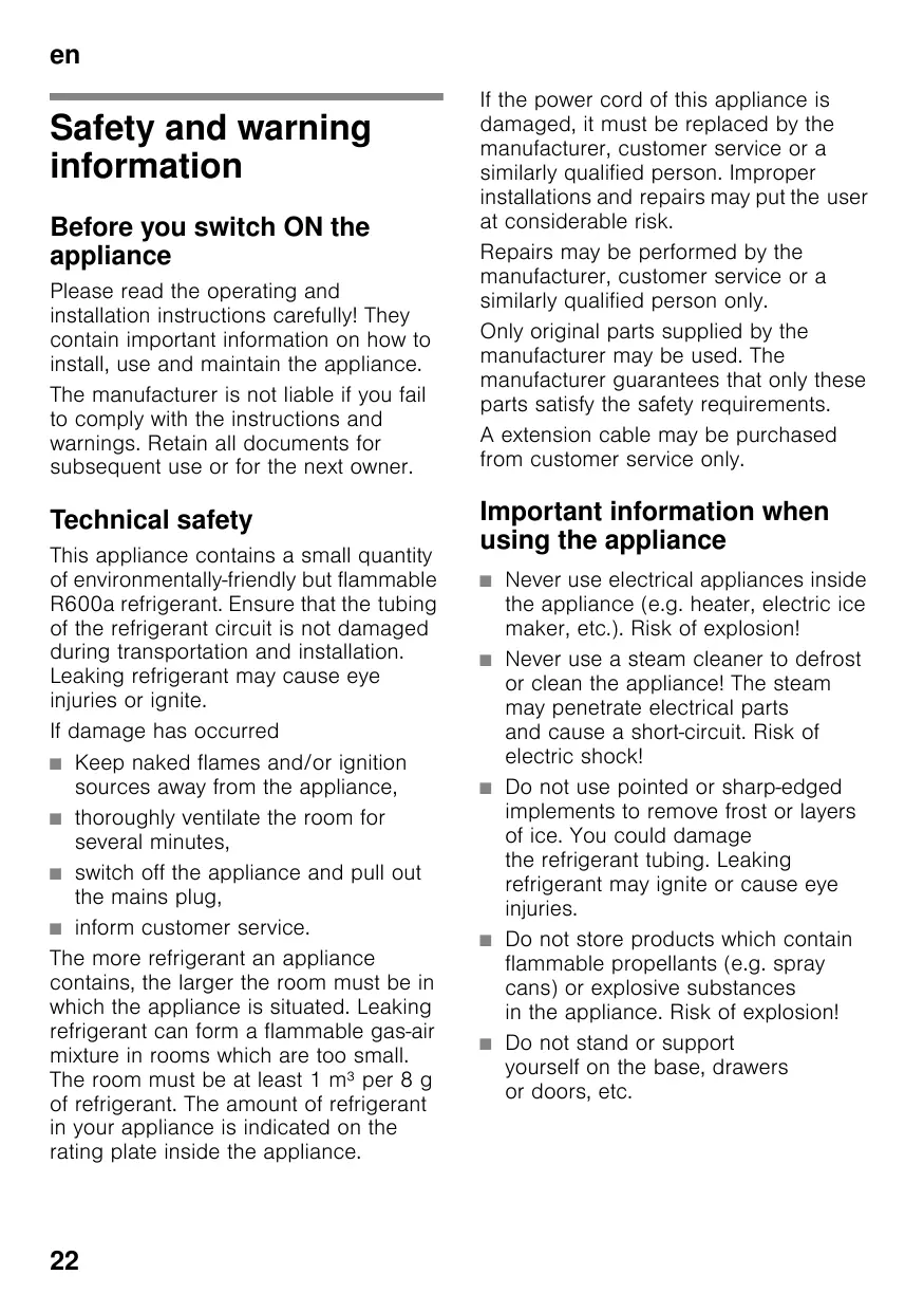 enTable of ContentsenI struction for Use Safety and warning information Before you switch ON the appliance Please read the operating and installation instructions carefully! They contain important information on how to install, use and maintain the appliance. The manufacturer is not liable if you fail to comply with the instructions and warnings. Retain all documents for subsequent use or for the next owner. Technical safety This appliance contains a small quantity of environmentally-friendly but flammable R600a refrigerant. Ensure that the tubing of the refrigerant circuit is not damaged during transportation and installation. Leaking refrigerant may cause eye injuries or ignite. If damage has occurred ■ Keep naked flames and/or ignition sources away from the appliance, ■ thoroughly ventilate the room for several minutes, ■ switch off the appliance and pull out the mains plug, ■ inform customer service. The more refrigerant an appliance contains, the larger the room must be in which the appliance is situated. Leaking refrigerant can form a flammable gas-air mixture in rooms which are too small. The room must be at least 1 m³ per 8 g of refrigerant. The amount of refrigerant in your appliance is indicated on the rating plate inside the appliance.