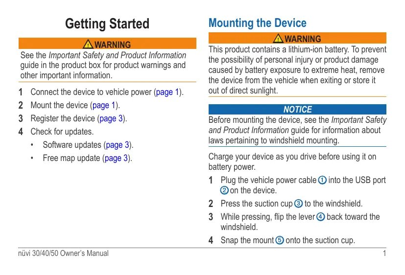 1 Connect the device to vehicle power (page 1). 2 Mount the device (page 1). 3 Register the device (page 3). 4 Check for updates. + Software updates (page 3). + Free map update (page 3).