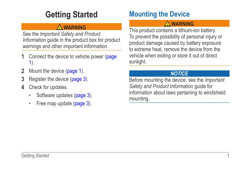 2 Mount the device (page 1). 3 Register the device (page 3). 4 Check for updates. + Software updates (page 3). + Free map update (page 3).