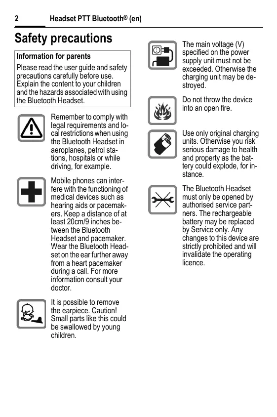 Safety precautions Information for parents Please read the user guide and safety precautions carefully before use. Explain the content to your children and the hazards associated with using the Bluetooth Headset. Remember to comply with legal requirements and local restrictions when using the Bluetooth Headset in aeroplanes, petrol stations, hospitals or while driving, for example. Mobile phones can interfere with the functioning of medical devices such as hearing aids or pacemakers. Keep a distance of at least 20cm/9 inches between the Bluetooth Headset and pacemaker. Wear the Bluetooth Headset on the ear further away from a heart pacemaker during a call. For more information consult your doctor. It is possible to remove the earpiece. Caution! Small parts like this could be swallowed by young children. The main voltage (V) specified on the power supply unit must not be exceeded. Otherwise the charging unit may be destroyed. Do not throw the device into an open fire. Use only original charging units. Otherwise you risk serious damage to health and property as the battery could explode, for instance. The Bluetooth Headset must only be opened by authorised service partners. The rechargeable battery may be replaced by Service only. Any changes to this device are strictly prohibited and will invalidate the operating licence. Headset PTT Bluetooth® (en) Important: Dispose of used batteries and Bluetooth Headsets according to the legal regulations. The Bluetooth Headset can interfere with the operation of nearby TVs, radios or PCs. Use only original accessories. In this way, you will avoid possible health risks and damage to the product, and ensure compliance with all relevant provisions. Improper use will invalidate the guarantee!