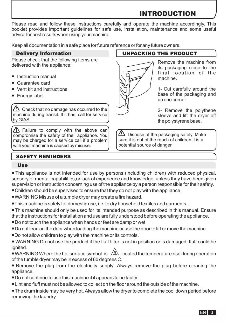 sleeve and lift the dryer off the polystyrene base. Dispose of the packaging safely. Make sure it is out of the reach of children,it is a potential source of danger. SAFETY REMINDERS Use ● This appliance is not intended for use by persons (including children) with reduced physical, sensory or mental capabilities,or lack of experience and knowledge, unless they have been given supervision or instruction concerning use of the appliance by a person responsible for their safety. ● Children should be supervised to ensure that they do not play with the appliance. ● WARNING Misuse of a tumble dryer may create a fire hazard. ●This machine is solely for domestic use, i.e. to dry household textiles and garments. ●This machine should only be used for its intended purpose as described in this manual. Ensure that the instructions for installation and use are fully understood before operating the appliance. ● Do not touch the appliance when hands or feet are damp or wet. ● Do not lean on the door when loading the machine or use the door to lift or move the machine. ●Do not allow children to play with the machine or its controls. ● WARNING Do not use the product if the fluff filter is not in position or is damaged; fluff could be ignited. ● WARNING Where the hot surface symbol is located the temperature rise during operation of the tumble dryer may be in excess of 60 degrees C. ● Remove the plug from the electricity supply. Always remove the plug before cleaning the appliance. ● Do not continue to use this machine if it appears to be faulty. ● Lint and fluff must not be allowed to collect on the floor around the outside of the machine. ● The drum inside may be very hot. Always allow the dryer to complete the cool down period before removing the laundry.