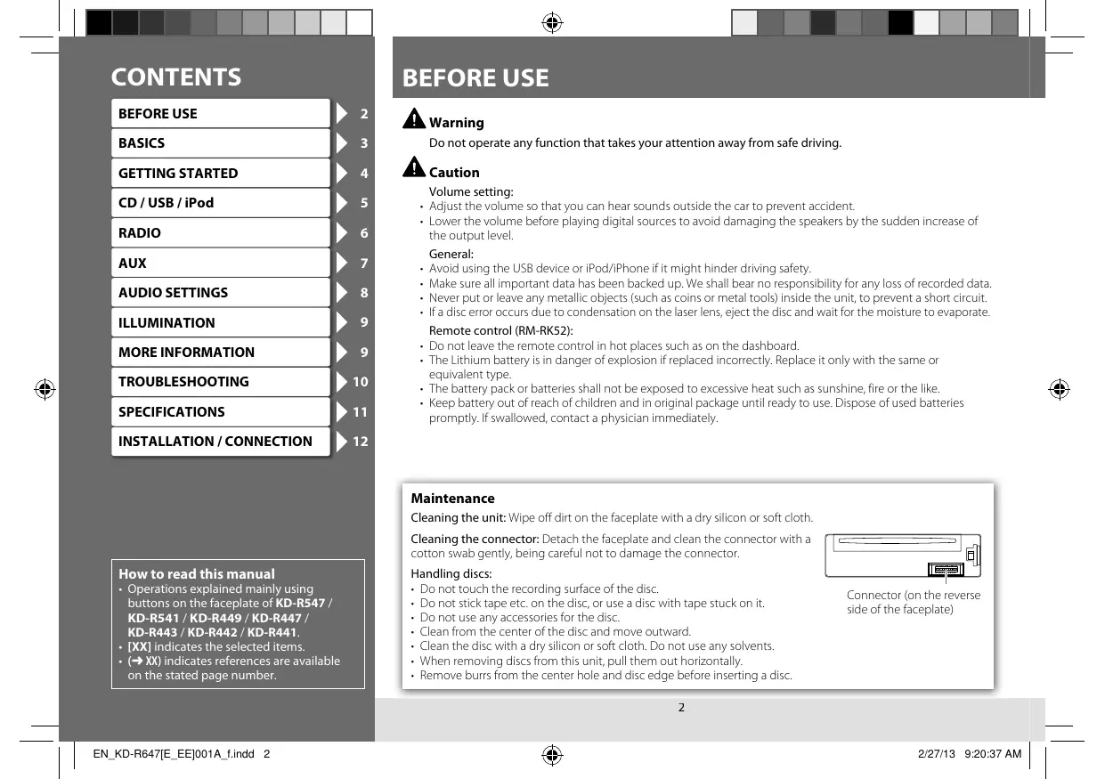 • Les opérations sont expliquées principalement en utilisant les touches de la façade du KD-R547 / KD-R541 / KD-R449 / KD-R447 / KD-R443 / KD-R442 / KD-R441. • [XX] indique les éléments choisis. • (➜ XX) indique que des références sont disponibles aux numéros de page cités. Nettoyage du connecteur: Détachez la façade et nettoyez le connecteur à l’aide d’un coton tige en faisant attention de ne pas endommager le connecteur. Manipulation des disques: • Ne pas toucher la surface d’enregistrement du disque. Connecteur (sur la face • Ne pas coller de ruban adhésif, etc. sur les disques et ne pas utiliser de disque arrière de la façade) avec du ruban adhésif collé dessus. • N’utilisez aucun accessoire pour le disque. • Nettoyer le disque en partant du centre vers l’extérieur. • Nettoyez le disque avec un chiffon sec au silicone ou un chiffon doux. N’utilisez aucun solvant. • Pour retirer les disques de cet appareil, tirez-les horizontalement. • Retirez les ébarbures du bord du trou central du disque avant d’insérer un disque. 2