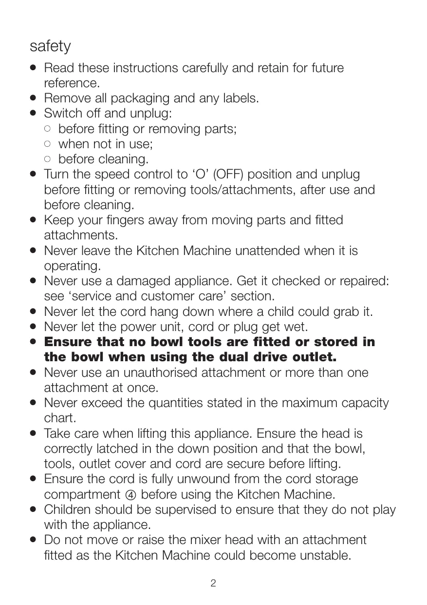 Read these instructions carefully and retain for future reference. Remove all packaging and any labels. Switch off and unplug: l before fitting or removing parts; l when not in use; l before cleaning. Turn the speed control to ‘O’ (OFF) position and unplug before fitting or removing tools/attachments, after use and before cleaning. Keep your fingers away from moving parts and fitted attachments. Never leave the Kitchen Machine unattended when it is operating. Never use a damaged appliance. Get it checked or repaired: see ‘service and customer care’ section. Never let the cord hang down where a child could grab it. Never let the power unit, cord or plug get wet. Ensure that no bowl tools are fitted or stored in the bowl when using the dual drive outlet. Never use an unauthorised attachment or more than one attachment at once. Never exceed the quantities stated in the maximum capacity chart. Take care when lifting this appliance. Ensure the head is correctly latched in the down position and that the bowl, tools, outlet cover and cord are secure before lifting. Ensure the cord is fully unwound from the cord storage compartment 4 before using the Kitchen Machine. Children should be supervised to ensure that they do not play with the appliance. Do not move or raise the mixer head with an attachment fitted as the Kitchen Machine could become unstable.
