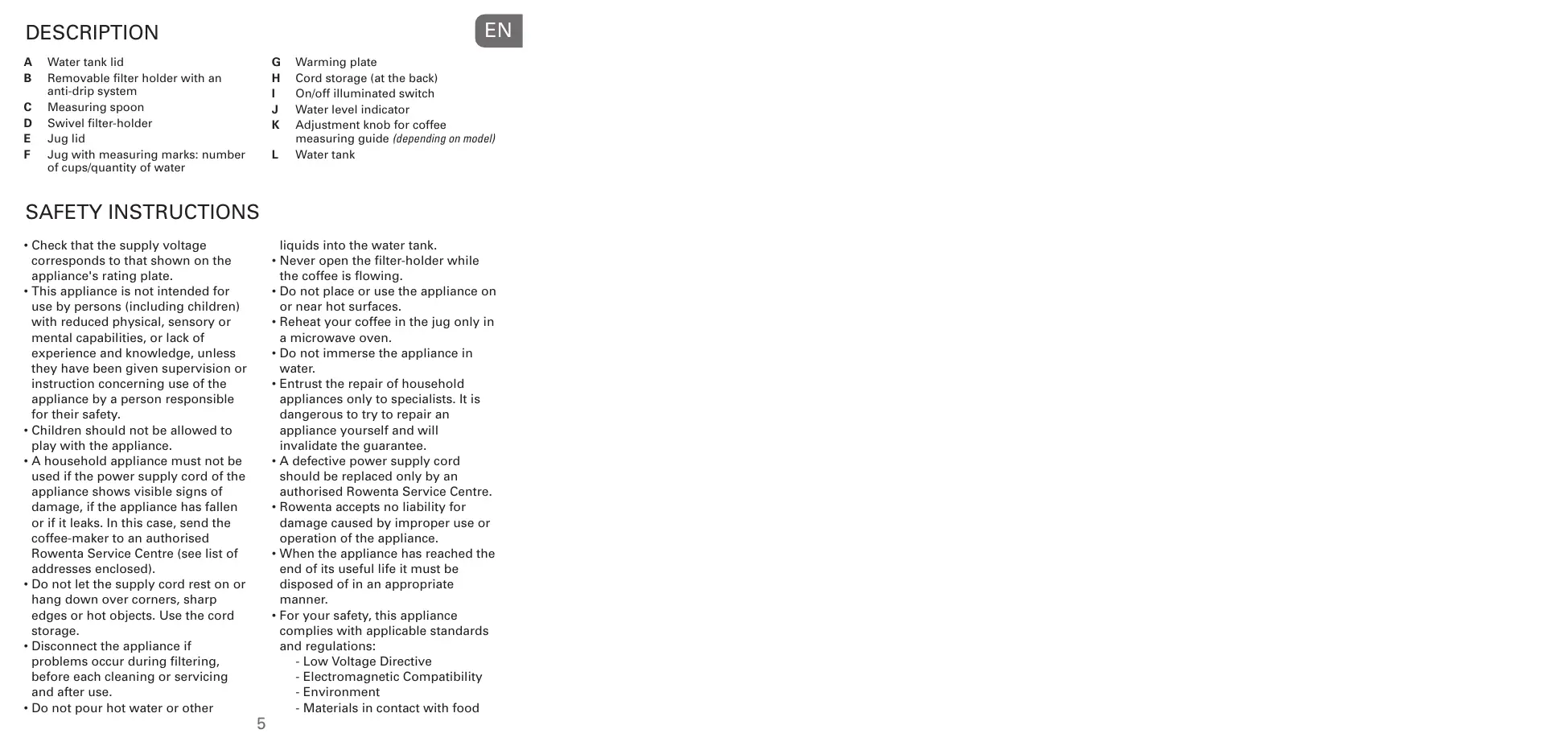 • Never open the filter-holder while the coffee is flowing. • Do not place or use the appliance on or near hot surfaces. • Reheat your coffee in the jug only in a microwave oven. • Do not immerse the appliance in water. • Entrust the repair of household appliances only to specialists. It is dangerous to try to repair an appliance yourself and will invalidate the guarantee. • A defective power supply cord should be replaced only by an authorised Rowenta Service Centre. • Rowenta accepts no liability for damage caused by improper use or operation of the appliance. • When the appliance has reached the end of its useful life it must be disposed of in an appropriate manner. • For your safety, this appliance complies with applicable standards and regulations: - Low Voltage Directive - Electromagnetic Compatibility - Environment - Materials in contact with food