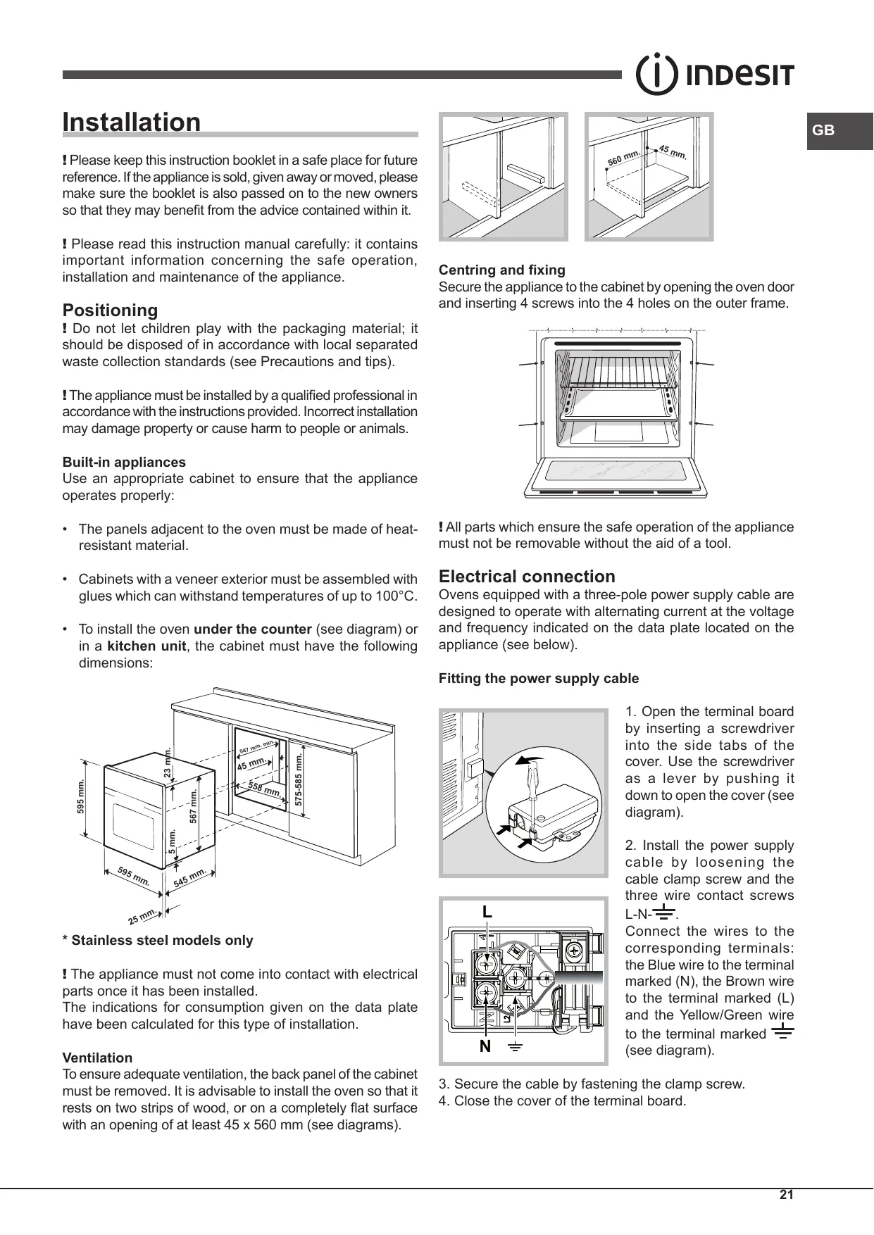 ! The appliance must not come into contact with electrical parts once it has been installed. The indications for consumption given on the data plate have been calculated for this type of installation. Ventilation To ensure adequate ventilation, the back panel of the cabinet must be removed. It is advisable to install the oven so that it rests on two strips of wood, or on a completely flat surface with an opening of at least 45 x 560 mm (see diagrams).