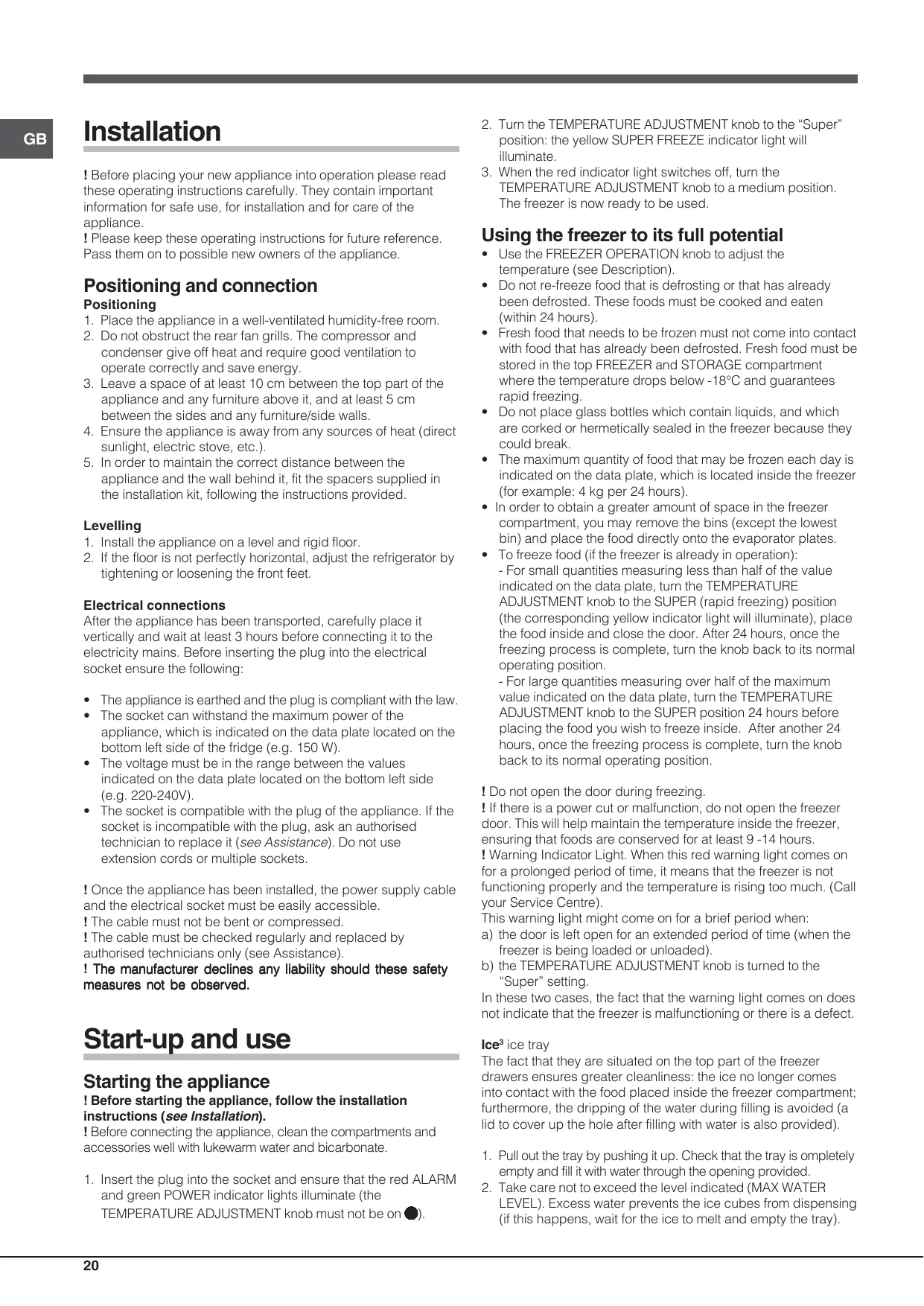 • Do not re-freeze food that is defrosting or that has already been defrosted. These foods must be cooked and eaten (within 24 hours). • Fresh food that needs to be frozen must not come into contact with food that has already been defrosted. Fresh food must be stored in the top FREEZER and STORAGE compartment where the temperature drops below -18°C and guarantees rapid freezing. • Do not place glass bottles which contain liquids, and which are corked or hermetically sealed in the freezer because they could break. • The maximum quantity of food that may be frozen each day is indicated on the data plate, which is located inside the freezer (for example: 4 kg per 24 hours). • In order to obtain a greater amount of space in the freezer compartment, you may remove the bins (except the lowest bin) and place the food directly onto the evaporator plates. • To freeze food (if the freezer is already in operation): - For small quantities measuring less than half of the value indicated on the data plate, turn the TEMPERATURE ADJUSTMENT knob to the SUPER (rapid freezing) position (the corresponding yellow indicator light will illuminate), place the food inside and close the door. After 24 hours, once the freezing process is complete, turn the knob back to its normal operating position. - For large quantities measuring over half of the maximum value indicated on the data plate, turn the TEMPERATURE ADJUSTMENT knob to the SUPER position 24 hours before placing the food you wish to freeze inside. After another 24 hours, once the freezing process is complete, turn the knob back to its normal operating position. ! Do not open the door during freezing. ! If there is a power cut or malfunction, do not open the freezer door. This will help maintain the temperature inside the freezer, ensuring that foods are conserved for at least 9 -14 hours. ! Warning Indicator Light. When this red warning light comes on for a prolonged period of time, it means that the freezer is not functioning properly and the temperature is rising too much. (Call your Service Centre). This warning light might come on for a brief period when: a) the door is left open for an extended period of time (when the freezer is being loaded or unloaded). b) the TEMPERATURE ADJUSTMENT knob is turned to the “Super” setting. In these two cases, the fact that the warning light comes on does not indicate that the freezer is malfunctioning or there is a defect. Ice3 ice tray The fact that they are situated on the top part of the freezer drawers ensures greater cleanliness: the ice no longer comes into contact with the food placed inside the freezer compartment; furthermore, the dripping of the water during filling is avoided (a lid to cover up the hole after filling with water is also provided). 1. Pull out the tray by pushing it up. Check that the tray is ompletely empty and fill it with water through the opening provided. 2. Take care not to exceed the level indicated (MAX WATER LEVEL). Excess water prevents the ice cubes from dispensing (if this happens, wait for the ice to melt and empty the tray).