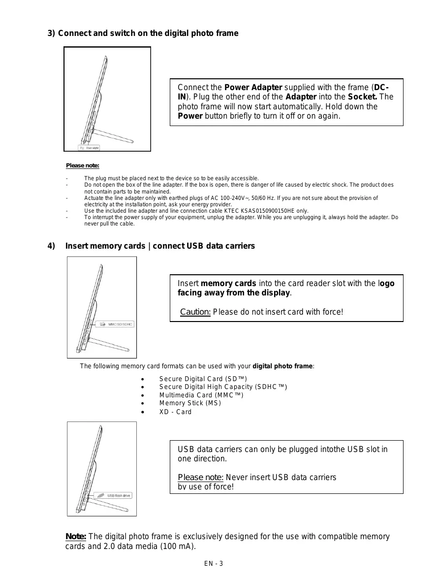 Note: The digital photo frame is exclusively designed for the use with compatible memory cards and 2.0 data media (100 mA).