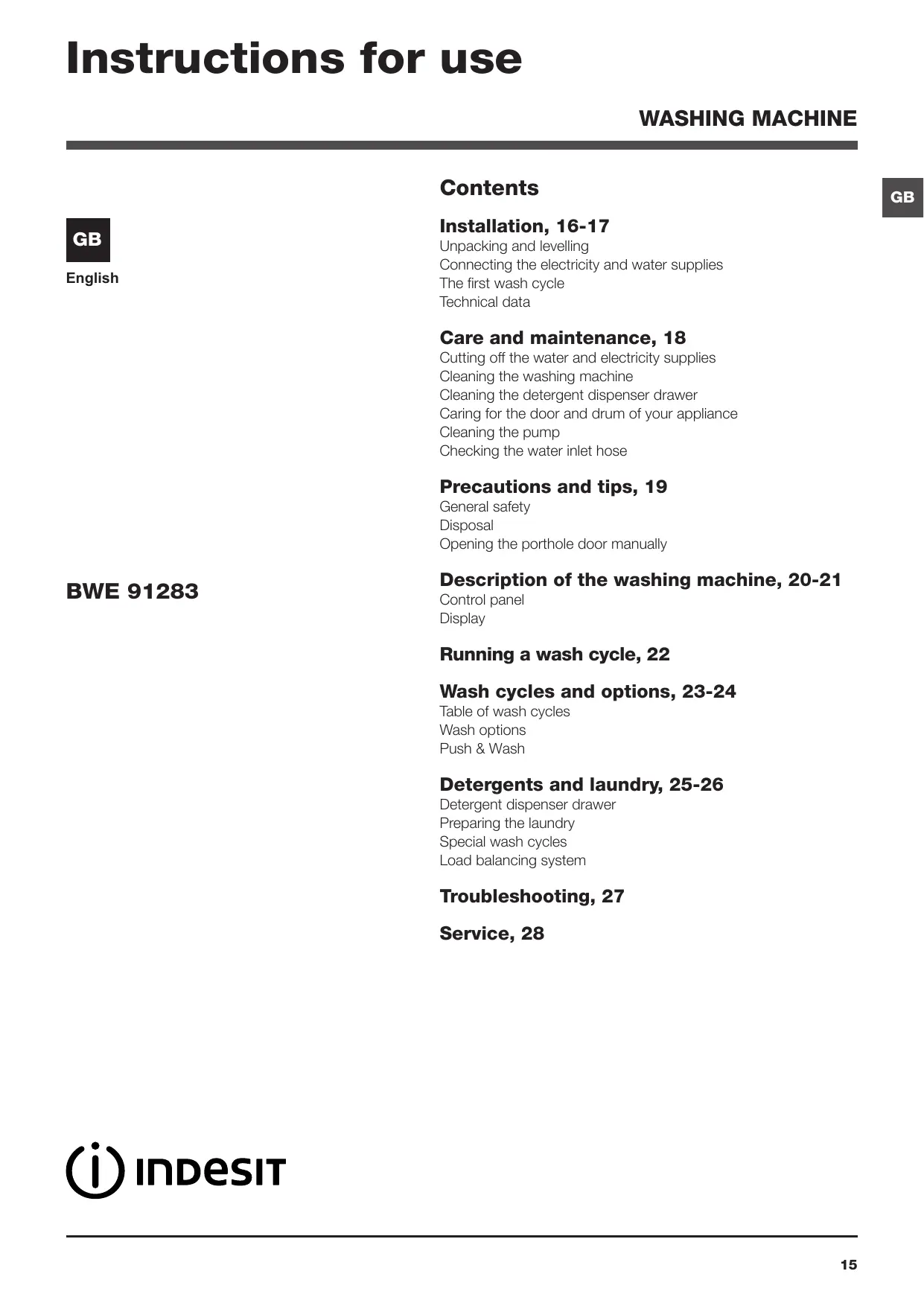 GB Installation, 16-17 Unpacking and levelling Connecting the electricity and water supplies The first wash cycle Technical data