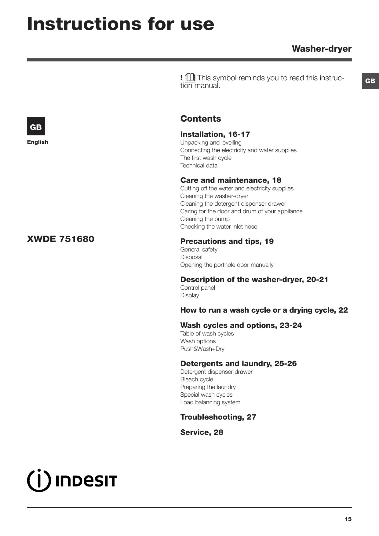Download the instructions for your Washer dryer in PDF format for free! Find your manual XWDE 751680X W FR - INDESIT and take your electronic device back in hand. On this page are published all the documents necessary for the use of your device. XWDE 751680X W FR by INDESIT.