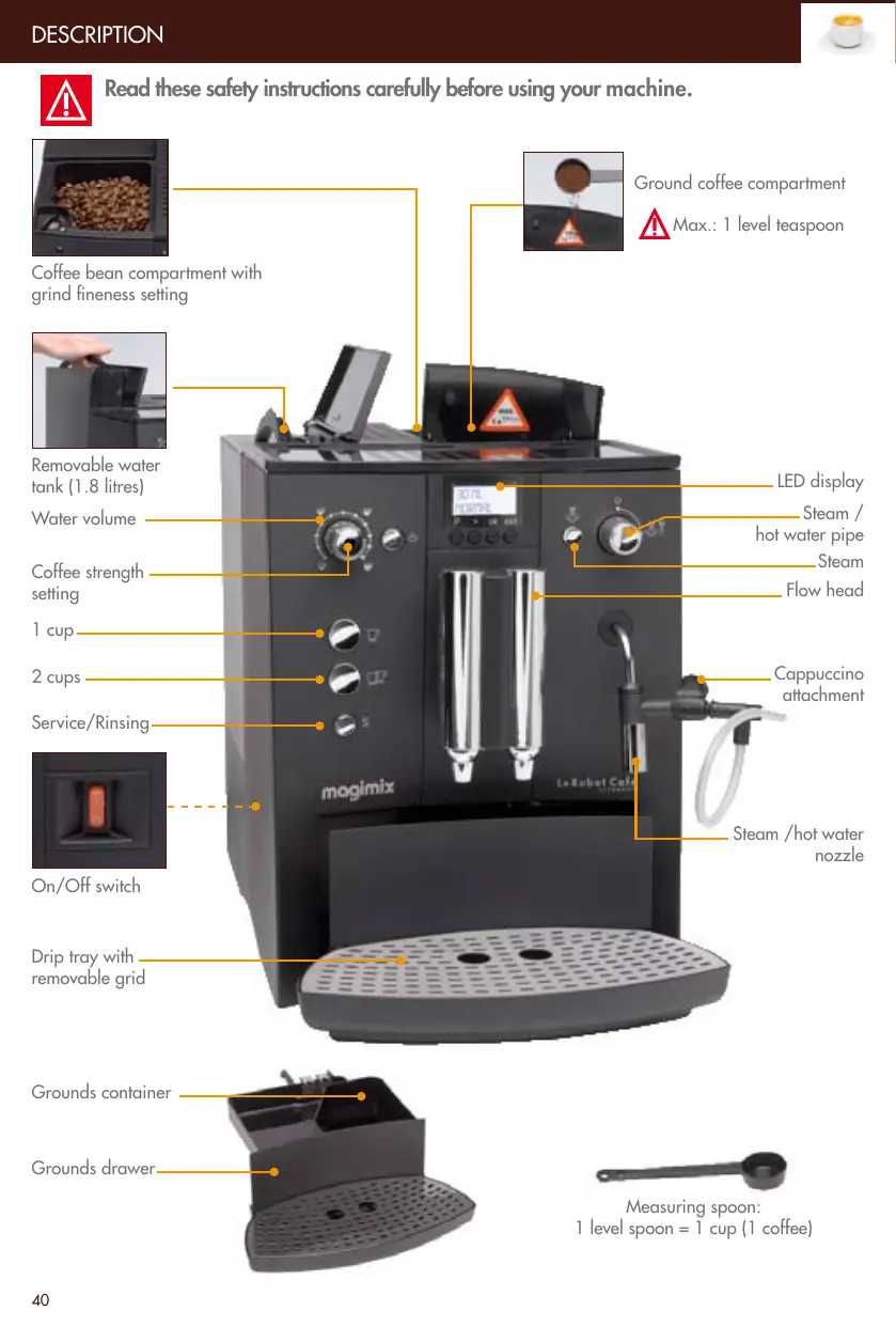 Description Read these safety instructions carefully before using your machine. Ground coffee compartment Max.: 1 level teaspoon Coffee bean compartment with grind fineness setting Removable water tank (1.8 litres) Water volume Coffee strength setting LED display Steam / hot water pipe Steam Flow head 1 cup 2 cups Cappuccino attachment Service/Rinsing Steam /hot water nozzle On/Off switch Drip tray with removable grid Grounds container Grounds drawer Measuring spoon: 1 level spoon = 1 cup (1 coffee)