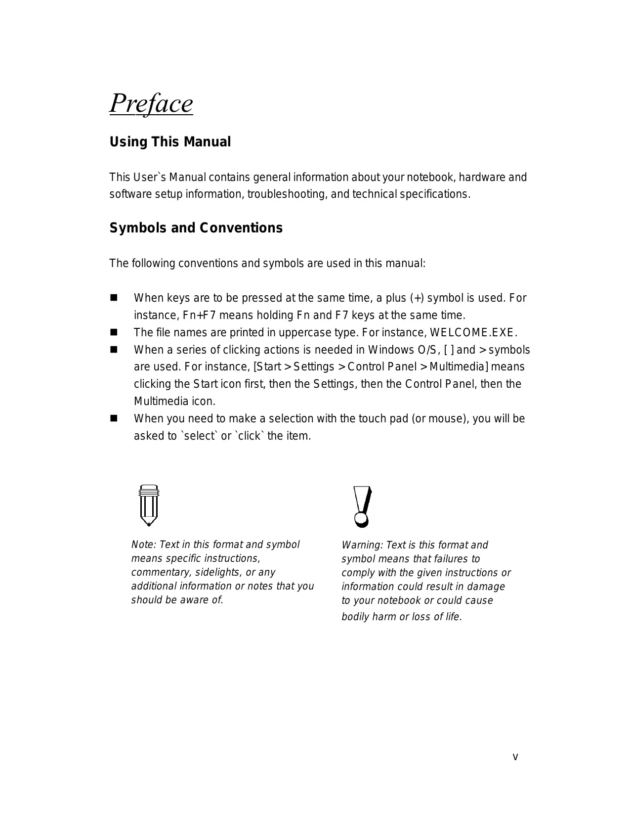 When keys are to be pressed at the same time, a plus (+) symbol is used. For instance, Fn+F7 means holding Fn and F7 keys at the same time. The file names are printed in uppercase type. For instance, WELCOME.EXE. When a series of clicking actions is needed in Windows O/S, [ ] and > symbols are used. For instance, [Start > Settings > Control Panel > Multimedia] means clicking the Start icon first, then the Settings, then the Control Panel, then the Multimedia icon. When you need to make a selection with the touch pad (or mouse), you will be asked to `select` or `click` the item. Note: Text in this format and symbol means specific instructions, commentary, sidelights, or any additional information or notes that you should be aware of.