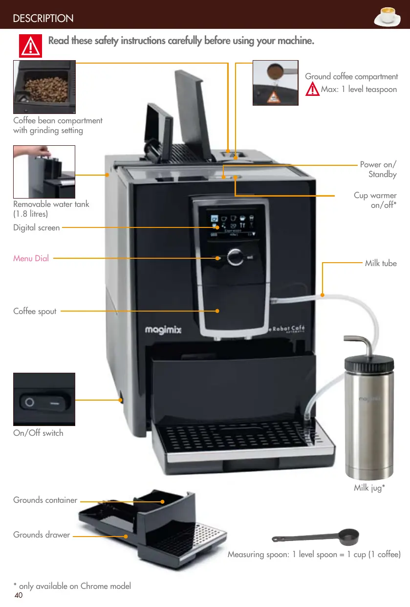 DESCRIPTION Read these safety instructions carefully before using your machine. Ground coffee compartment Max: 1 level teaspoon Coffee bean compartment with grinding setting Power on/ Standby Removable water tank (1.8 litres) Cup warmer on/off* Digital screen Menu Dial Milk tube Coffee spout On/Off switch Milk jug* Grounds container Grounds drawer Measuring spoon: 1 level spoon = 1 cup (1 coffee)