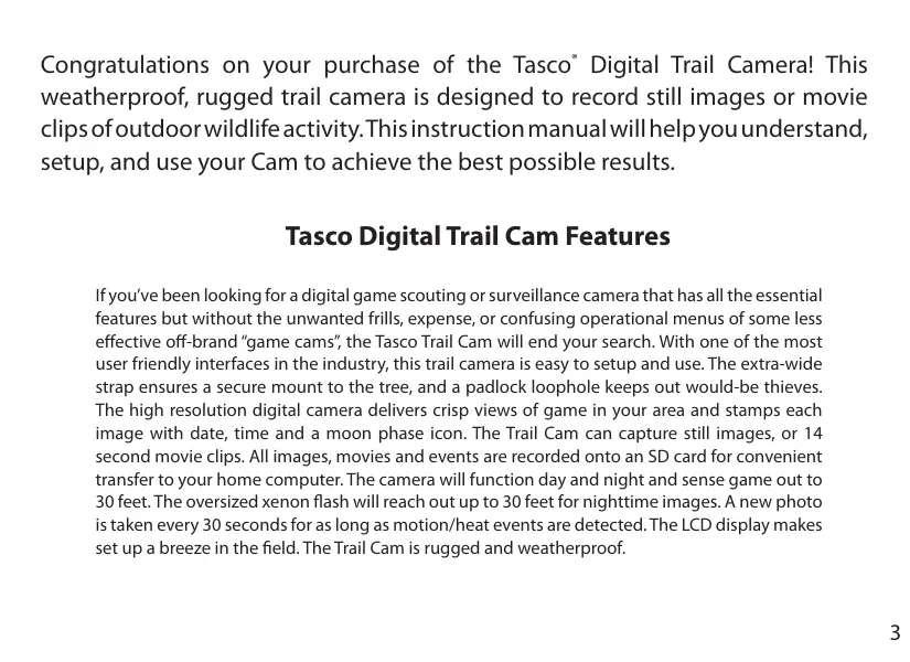 Congratulations on your purchase of the Tasco® Digital Trail Camera! This weatherproof, rugged trail camera is designed to record still images or movie clips of outdoor wildlife activity. This instruction manual will help you understand, setup, and use your Cam to achieve the best possible results. Tasco Digital Trail Cam Features If you’ve been looking for a digital game scouting or surveillance camera that has all the essential features but without the unwanted frills, expense, or confusing operational menus of some less effective off-brand “game cams”, the Tasco Trail Cam will end your search. With one of the most user friendly interfaces in the industry, this trail camera is easy to setup and use. The extra-wide strap ensures a secure mount to the tree, and a padlock loophole keeps out would-be thieves. The high resolution digital camera delivers crisp views of game in your area and stamps each image with date, time and a moon phase icon. The Trail Cam can capture still images, or 14 second movie clips. All images, movies and events are recorded onto an SD card for convenient transfer to your home computer. The camera will function day and night and sense game out to 30 feet. The oversized xenon flash will reach out up to 30 feet for nighttime images. A new photo is taken every 30 seconds for as long as motion/heat events are detected. The LCD display makes set up a breeze in the field. The Trail Cam is rugged and weatherproof.