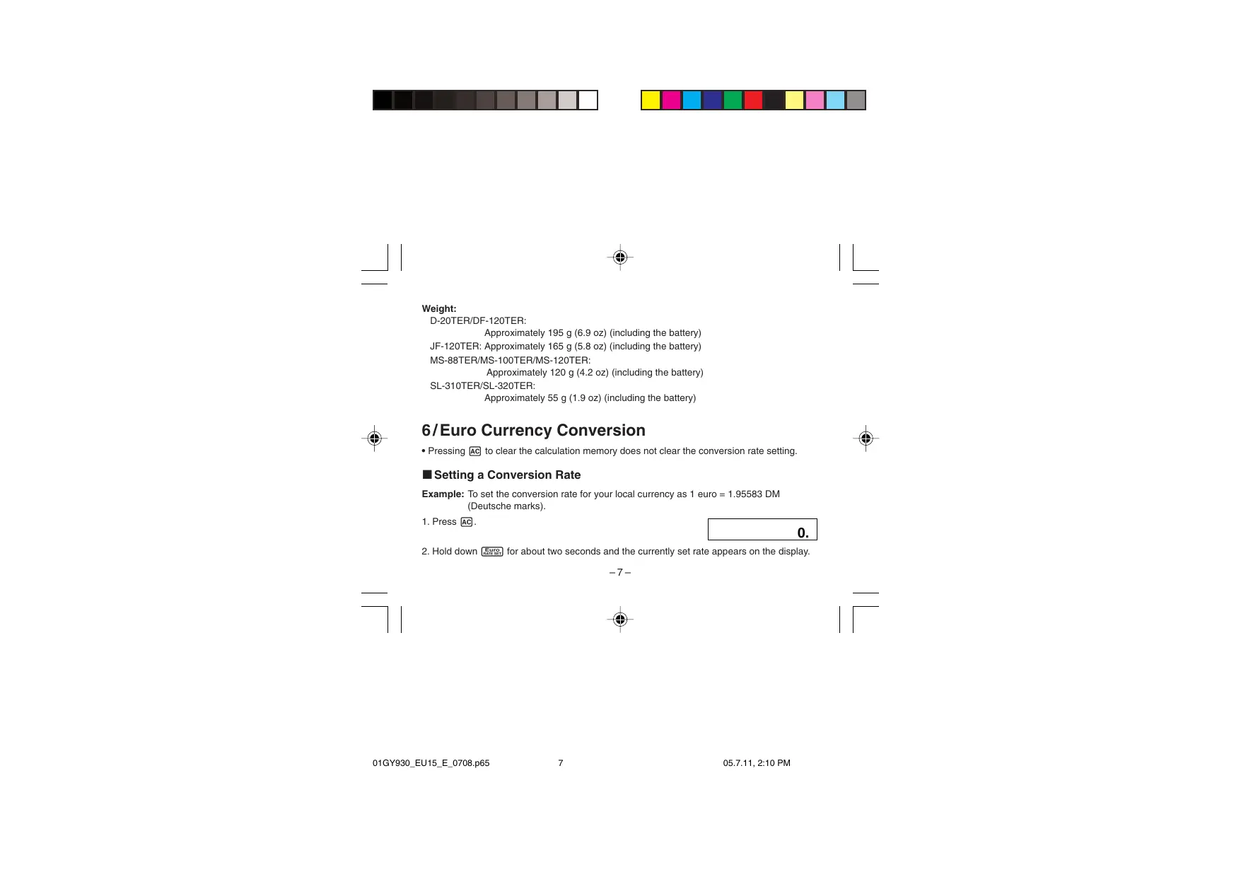 = Addiert das Rechenergebnis zum Gesamtsummenspeicher. Le système de point flottant est utilisé pour calculer les résultats. (MS-88TER/MS-100TER/ MS-120TER/SL-310TER/SL-320TER) *2 Das Ergebnis der Umwandlung wird gerundet. Die Rundung wird gemäß den Wahlschalter-Einstellungen ausgeführt. (D-20TER/DF-120TER/JF-120TER) Le nombre de chiffres significatifs de ce produit est 11. • Des erreurs peuvent se produire lors des calculs de conversion de devises produisant des résultats plus grands que les valeurs indiquées ci-dessous. Korrekte Umrechnung gemäß Verordnung (EG) Nr. 1103/97 Die Anzahl der höchstwertigen Stellen dieses Produkts ist 11. • Wenn bei der Kalkulation einer Währungsumwandlung Beträge entstehen, die die untenstehenden Werte überschreiten, kann unter Umständen eine Fehlermeldung ausgegeben werden. Type à 10 chiffres