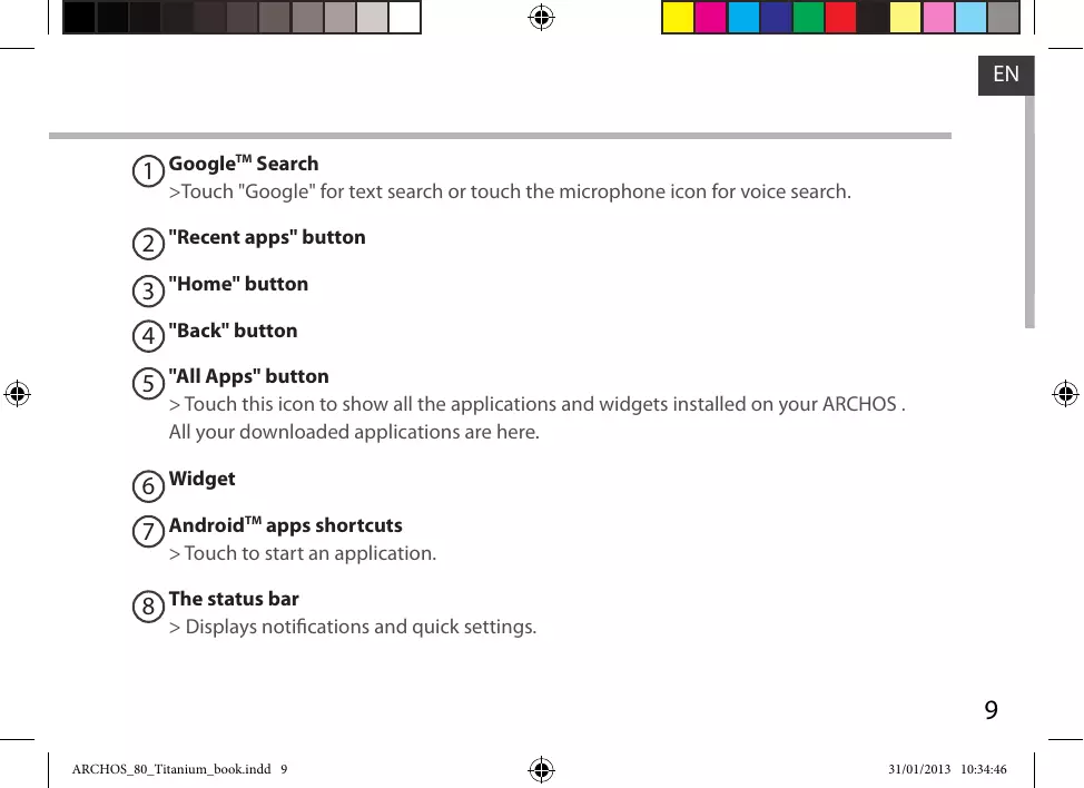 Private networks are shown with a lock icon and will require you to enter your password. TIPS: -- When entering a WiFi password, we recommend that you select “Show password” so you can see the characters you are typing. -- To get the correct WiFi password (or settings) for the network, contact the WiFi network provider. -- If your WiFi is on and you are in range of a network that you previously connected to, your ARCHOS will automatically attempt to connect to it. >Touch "Google" for text search or touch the microphone icon for voice search. 2 "Recent apps" button 3 "Home" button 4 "Back" button 5 "All Apps" button > Touch this icon to show all the applications and widgets installed on your ARCHOS . All your downloaded applications are here. > Touch to start an application. 8 The status bar > Displays notifications and quick settings. The AndroidTM Interface The Quick settings -- Airplane mode: To activate/deactivate all wireless connections, especially when flying. -- WiFi: To turn on/off your WiFi connection. -- Auto-rotate screen: To activate/deactivate automatic screen orientation as you turn your ARCHOS . -- Brightness: To adjust the screen brightness. -- Notifications: To activate/deactivate incoming notifications. -- Settings: To access all your settings. The Recent Apps Opens a list of thumbnail images of apps you’ve worked with recently: -- To open an app, touch it. -- To close an app, swipe it left or right. Getting familiar with AndroidTM The extended home screen: Navigate between different home screen panels by swiping left and right. Moving a home screen item: Touch and hold your finger onto it until the positioning gridlines appear, then slide it to the desired location, and release your finger. Removing a home screen item: Touch and hold it, slide your finger towards the top of the screen and drop it over the "Remove" icon. Uninstalling an item: From the "All apps" screens, touch and hold it, slide your finger towards the top of the screen and drop it over "Uninstall" bin. Creating application folders: Drop one app icon over another on a home screen and the two icons will be combined. Widgets: Touch the "All Apps" icon on your home screen. Touch "Widgets" at the top of the screen. From the main Widget screen, you can move around widgets just as you do for app icons. Changing your wallpaper: Hold your finger on a home screen at an empty location, then choose from the list. Locking the touchscreen: From the quick settings dashboard in the status bar, touch "Settings". In "Settings", scroll down and touch "Security". Touch "Screen lock". Touch the type of lock you would like to use. After you set a lock, a lock screen is displayed whenever your screen wakes up, requesting the pattern, pin or other specified key. Troubleshooting If your device is frozen: Press the ON/OFF button for 10 seconds or use the reset button. To use the reset button, press the “pinhole reset” button by using a sharp object such as a toothpick. If your device doesn’t turn on: