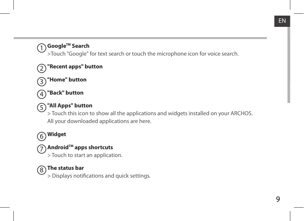 >Touch "Google" for text search or touch the microphone icon for voice search. 2 "Recent apps" button 3 "Home" button 4 "Back" button 5 "All Apps" button > Touch this icon to show all the applications and widgets installed on your ARCHOS. All your downloaded applications are here. > Touch to start an application. 8 The status bar > Displays notifications and quick settings.