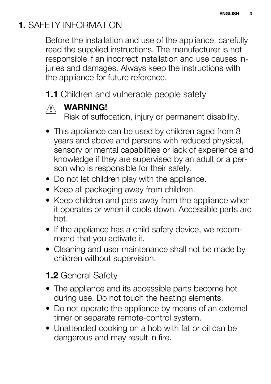 • This appliance can be used by children aged from 8 years and above and persons with reduced physical, sensory or mental capabilities or lack of experience and knowledge if they are supervised by an adult or a person who is responsible for their safety.